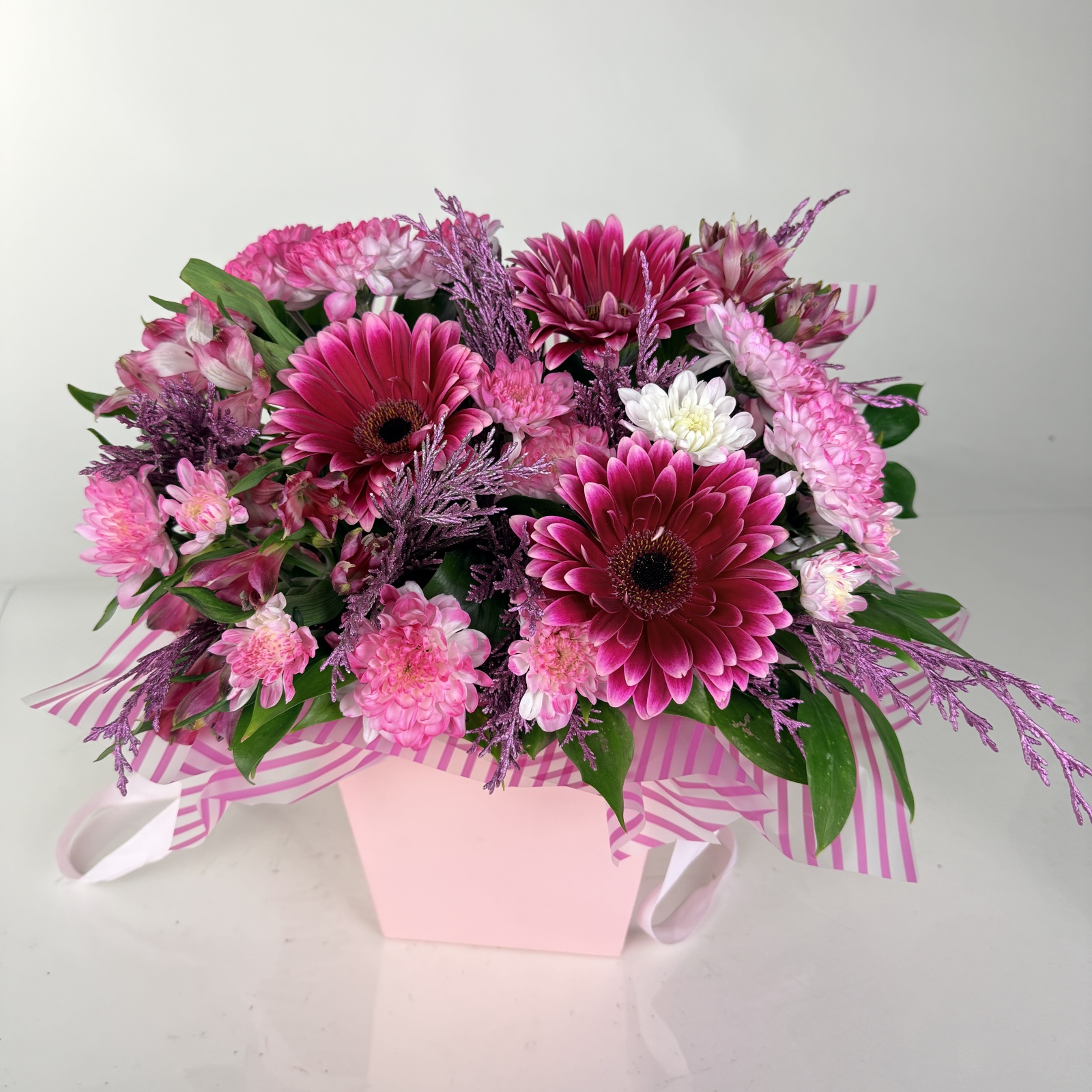Состав: роза 4, альстромерия 3, гербера 3, хризантема кустовая 2, рускус 0,5 и прочее. в наличии