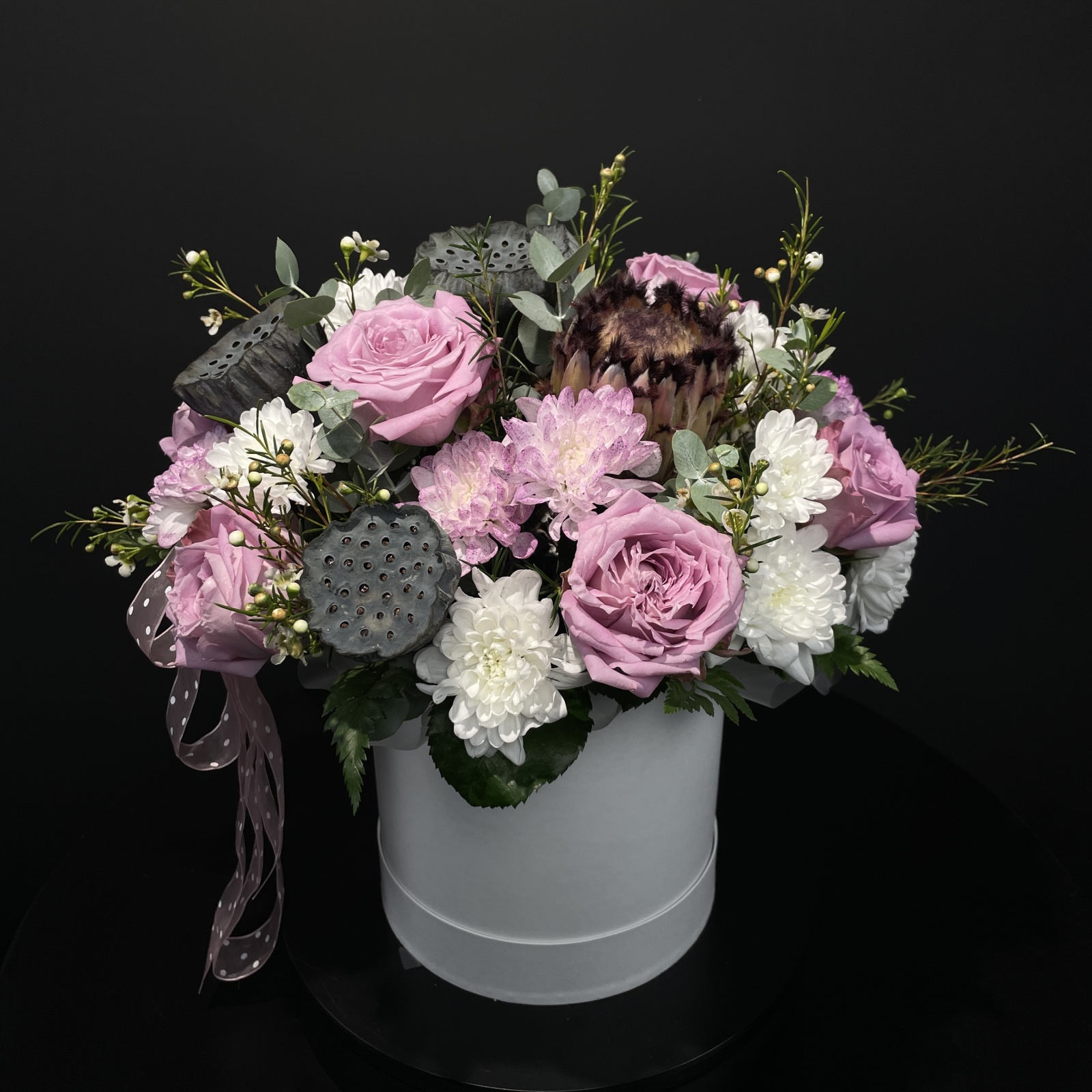 Состав: хризантема кустовая 5, роза 5, альстромерия 3, лизиантус 3, гербера 3, гортензия 2, эвкалипт 1, хризантема 1, рускус 0,5 и прочее. в наличии