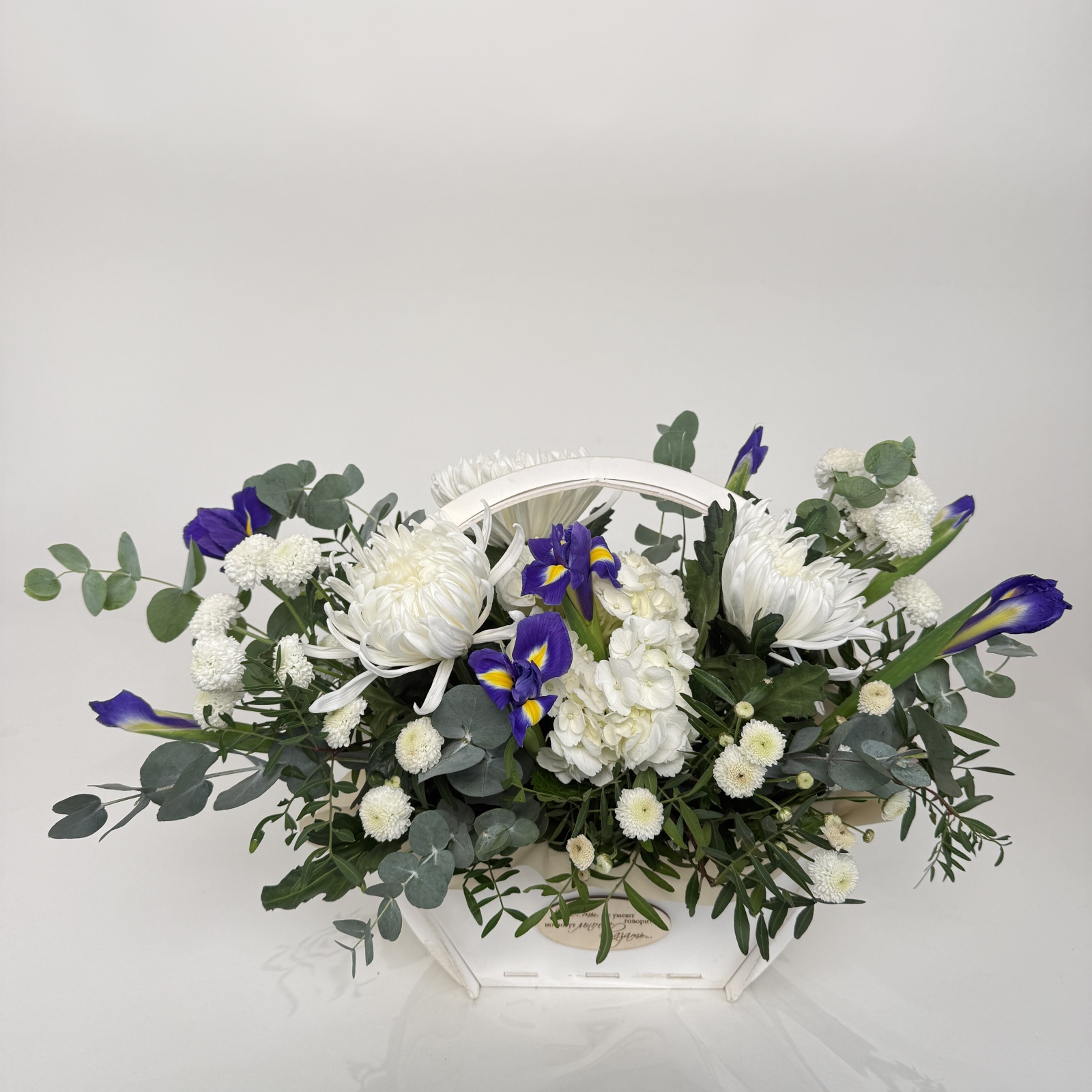 Состав: ирис 6, хризантема 3, хризантема кустовая 2, гортензия 1, фисташка 1 и прочее. в наличии