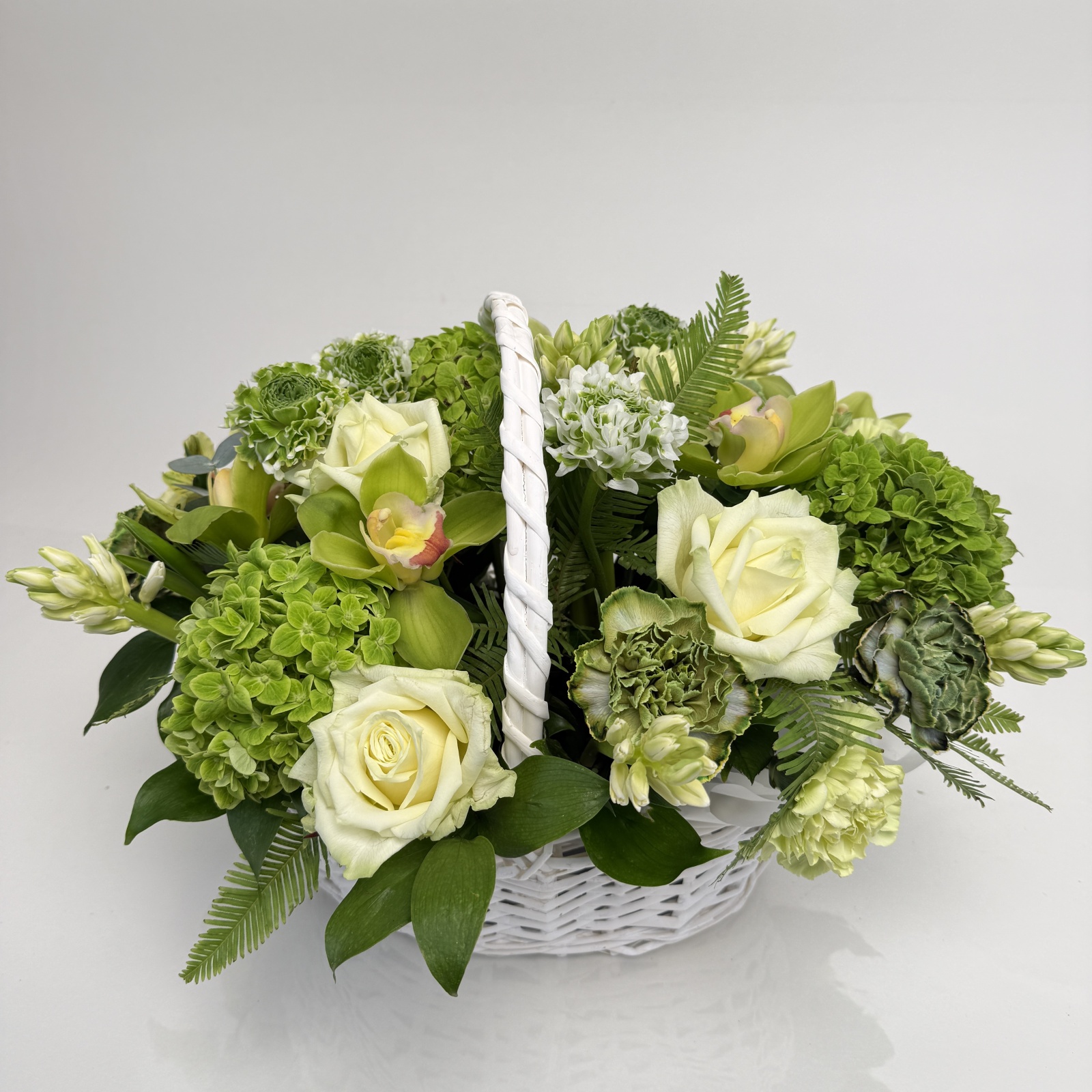 Состав: гвоздика 10, роза 5, гиацинт 5, ранункулюс 5, гортензия 3, альстромерия 1, рускус 0,5, ветка цимбидиум 0,2 и прочее.