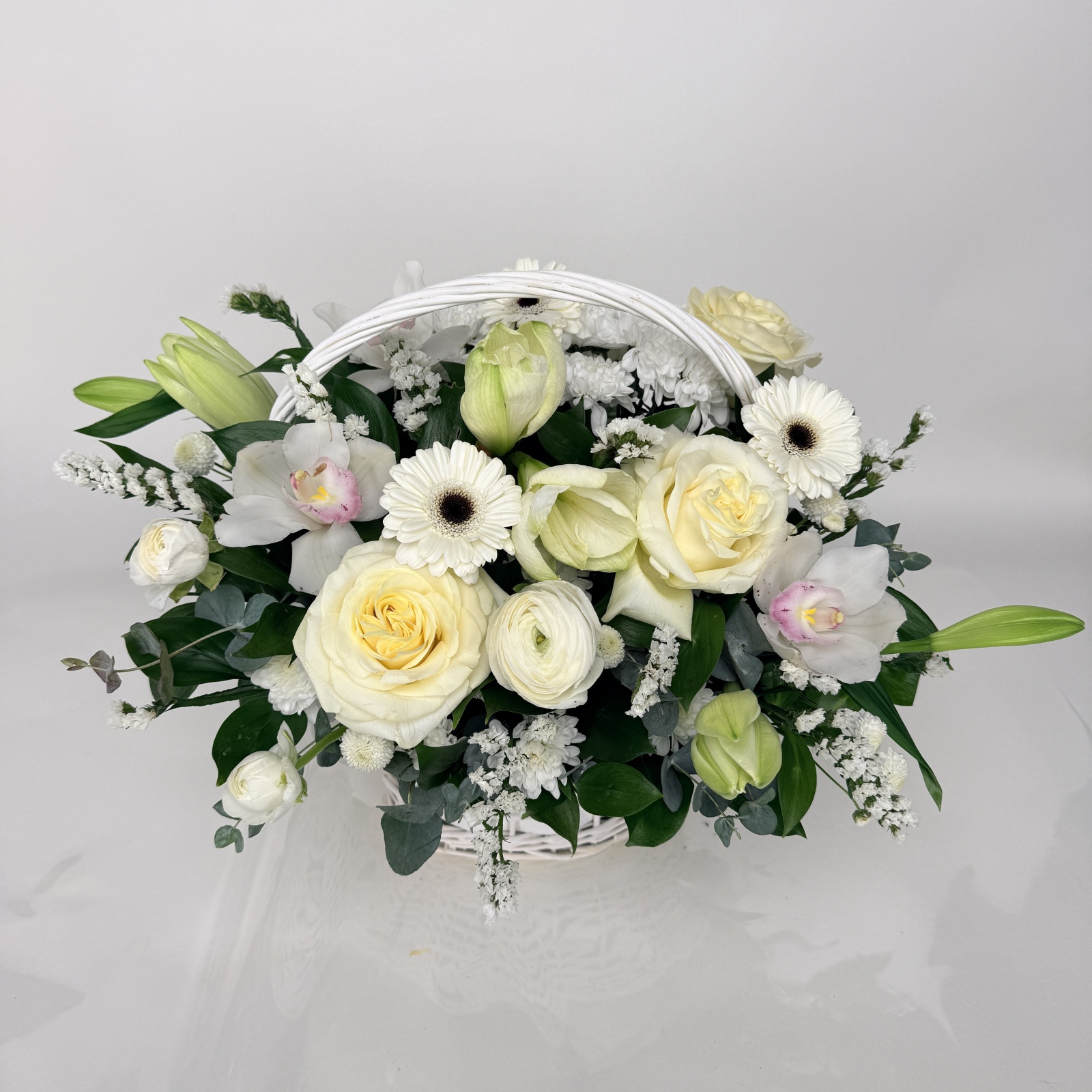 Состав: роза 5, гербера 3, ранункулюс 3, статица 2, лилия 2, хризантема кустовая 2, рускус 1, эвкалипт 1 и прочее. в наличии