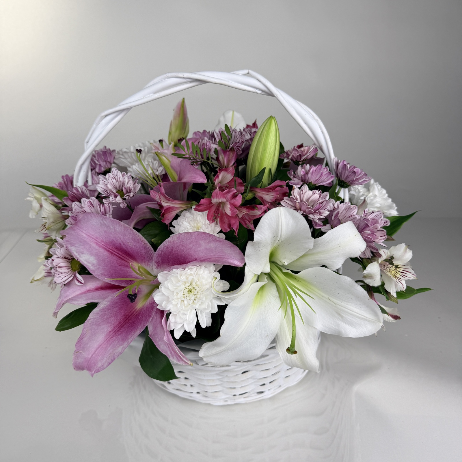 Состав: альстромерия 5, хризантема кустовая 5, лилия 2, рускус 1 и прочее. в наличии