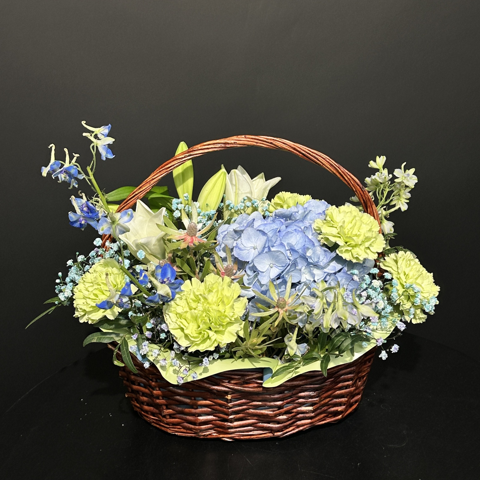 Состав: гвоздика 5, дельфиниум 2, лилия 2, леукадендрон 1, гортензия 1, фисташка 0,5 и прочее.