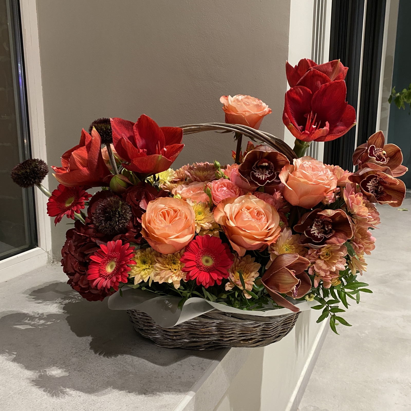 Состав: гербера 6, роза 5, хризантема кустовая 3, альстромерия 2, роза кустовая 2, гортензия 2, гиппеаструм 2, ветка цимбидиум 0,3, фисташка 0,3 и прочее. под заказ