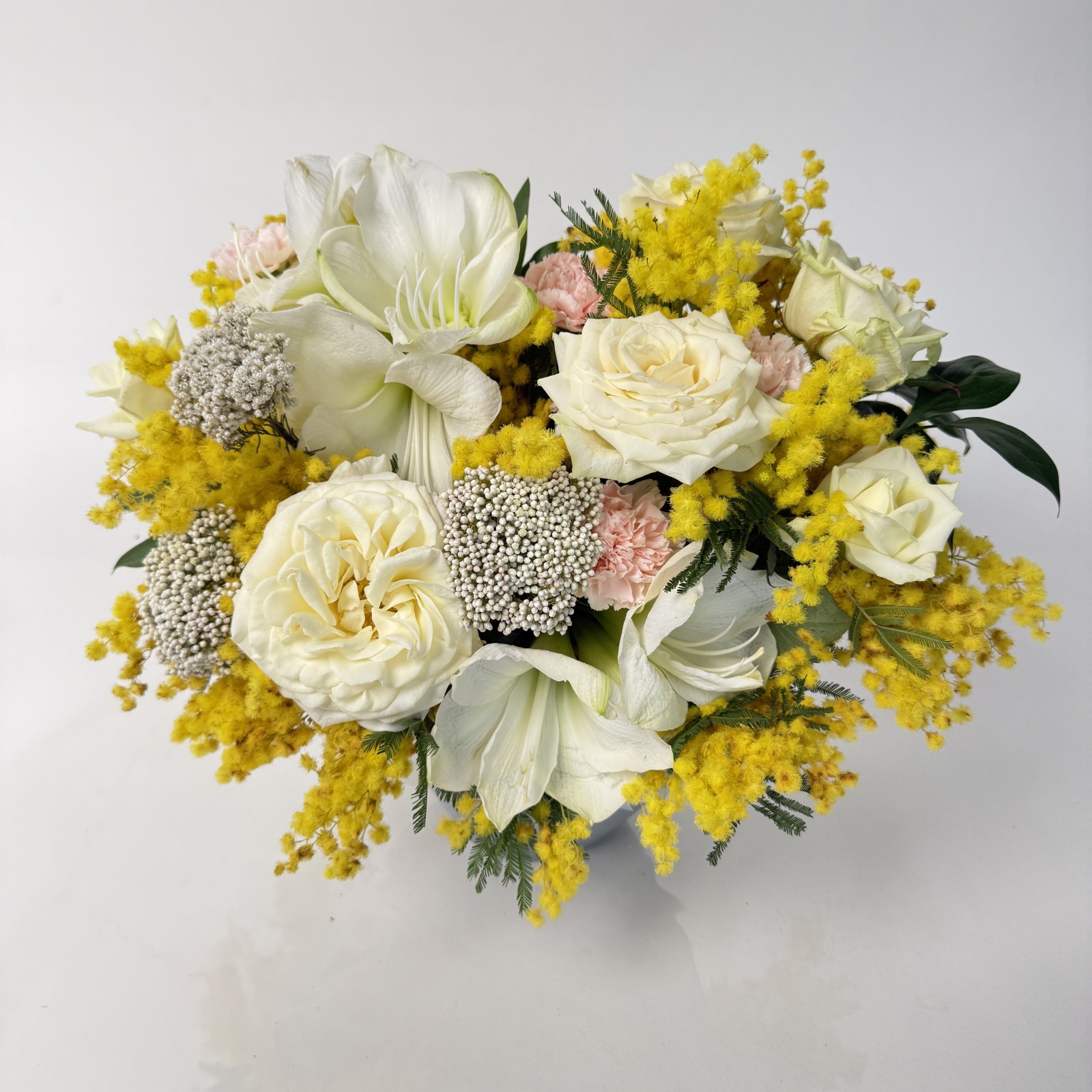 Состав: роза 5, гвоздика 5, вибурнум 1 и прочее. в наличии