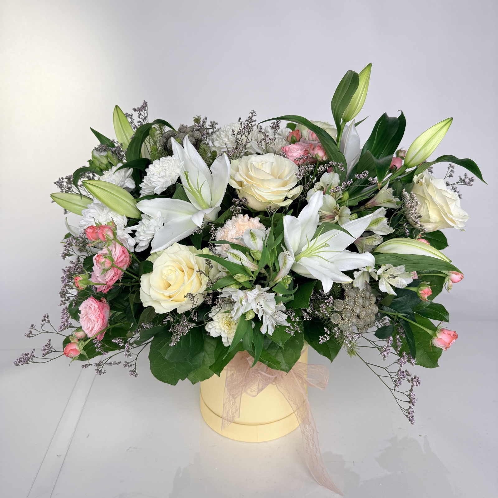 Состав: роза 5, альстромерия 4, гвоздика 2, хризантема кустовая 2, бруния 2, лилия 2, лимониум 2, салал 1, роза кустовая 1 и прочее. в наличии