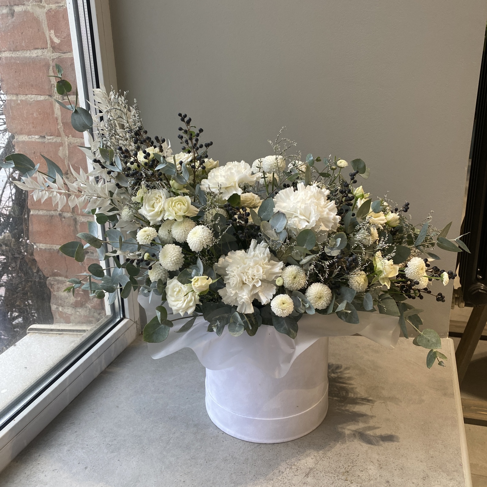 Состав: гвоздика 4, роза кустовая 2, хризантема кустовая 2, рускус 2, эвкалипт 2, лимониум 1 и прочее.