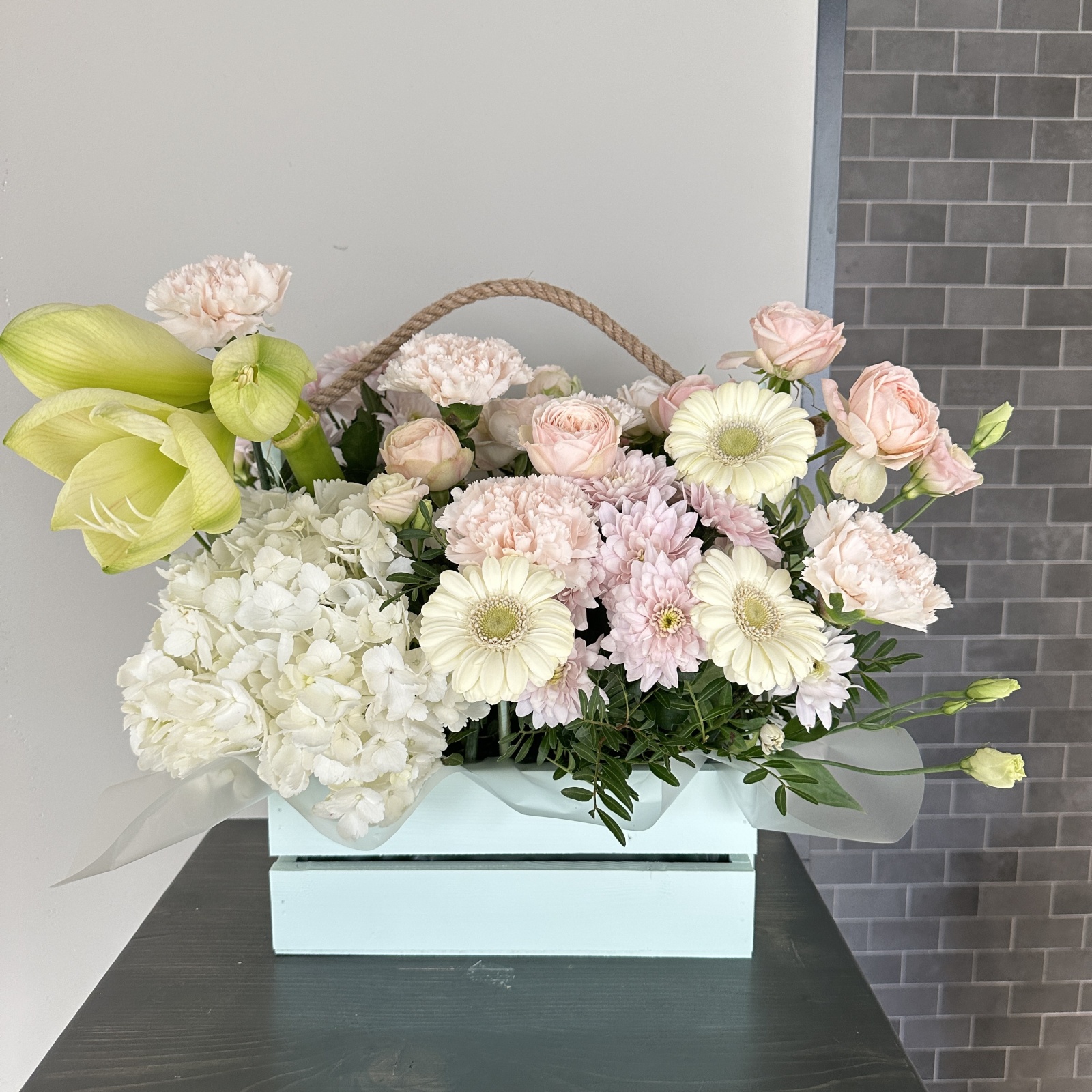 Состав: гвоздика 5, роза кустовая 3, гербера 3, хризантема кустовая 2, гортензия 1, альстромерия 1, фисташка 0,3 и прочее. под заказ