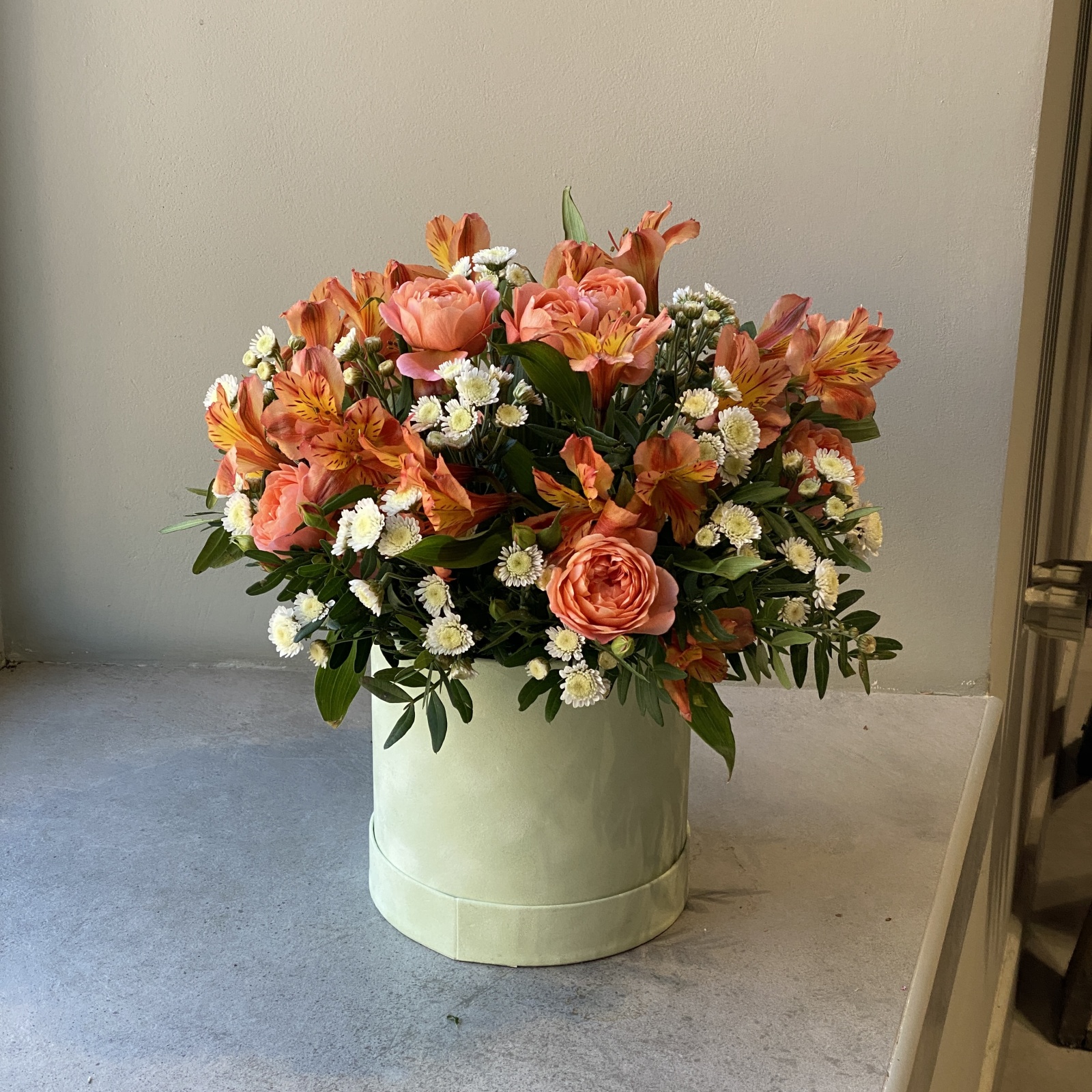 Состав: альстромерия 5, роза кустовая 1, фисташка 0,5 и прочее.