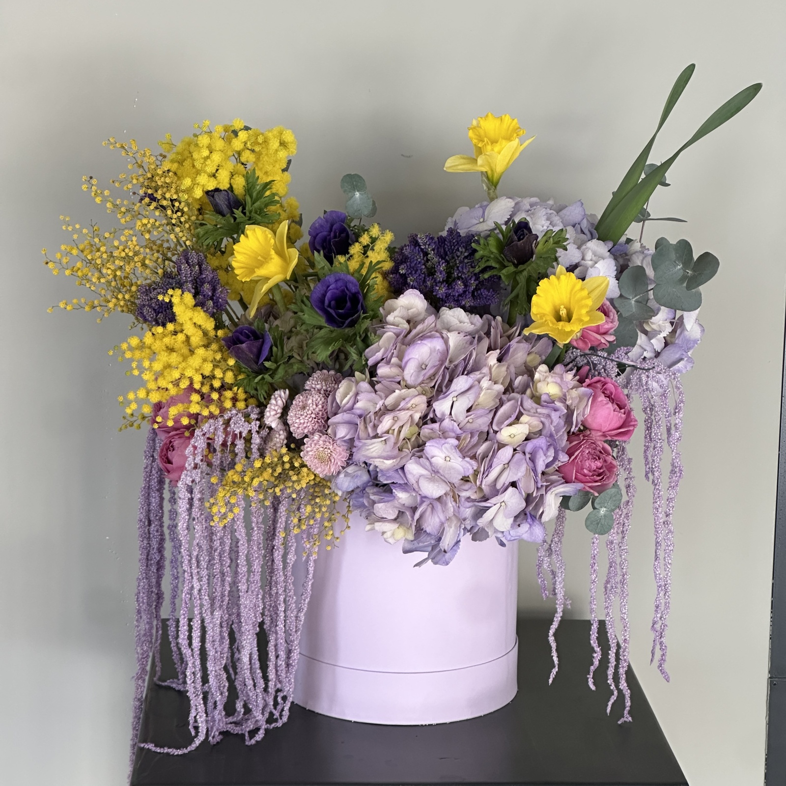 Состав: анемон 5, гортензия 3, хризантема 2, роза кустовая 1 и прочее. под заказ