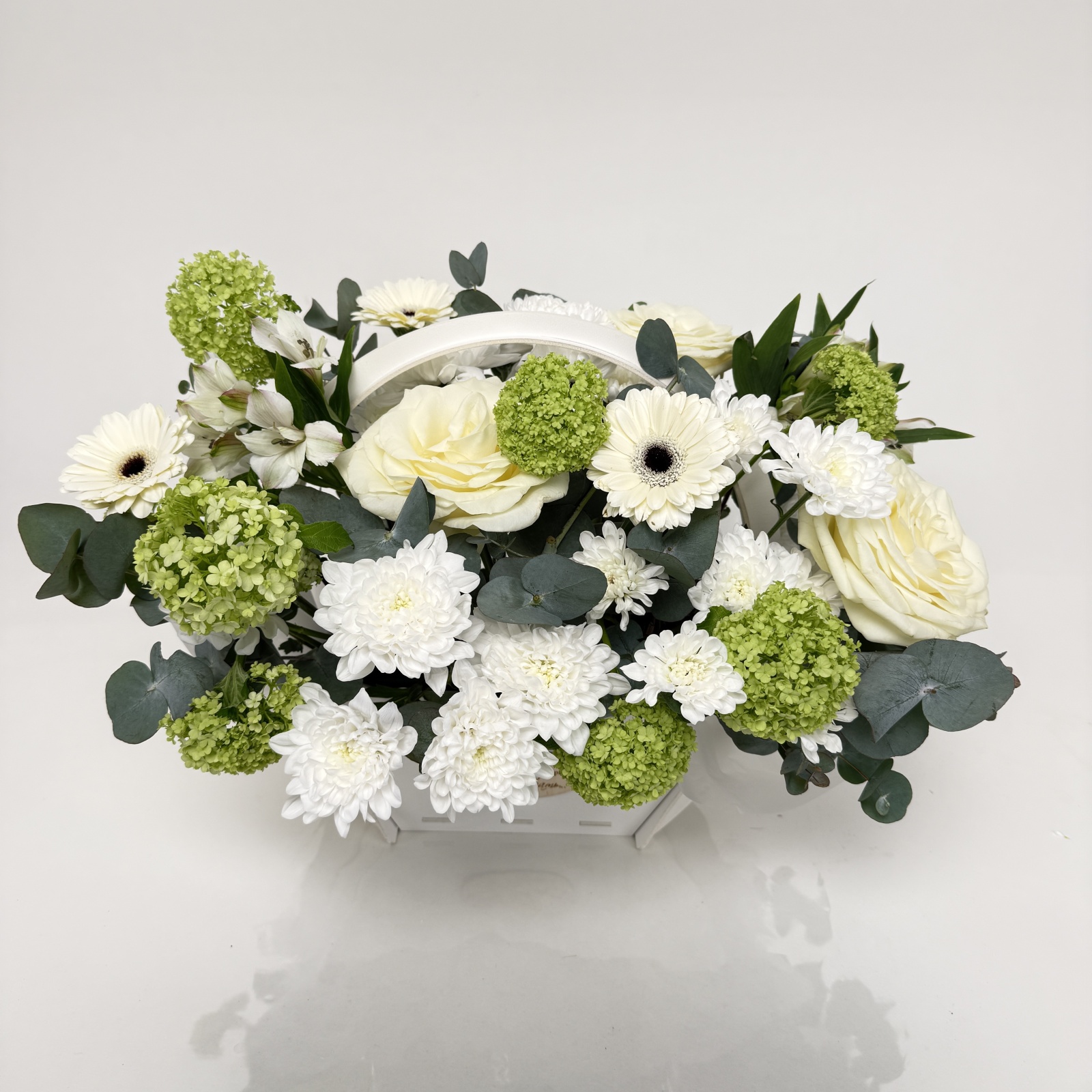 Состав: хризантема кустовая 3, гербера 3, роза 3, альстромерия 2, вибурнум 2, маттиола 2 и прочее.