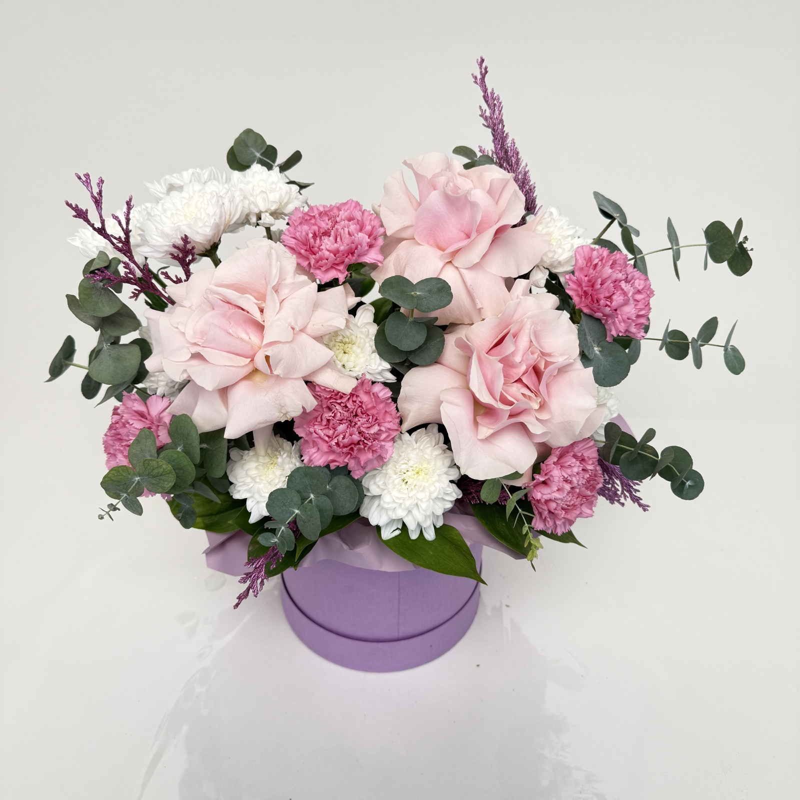 Состав: гвоздика 5, хризантема кустовая 4, роза 3, эвкалипт 1 и прочее.