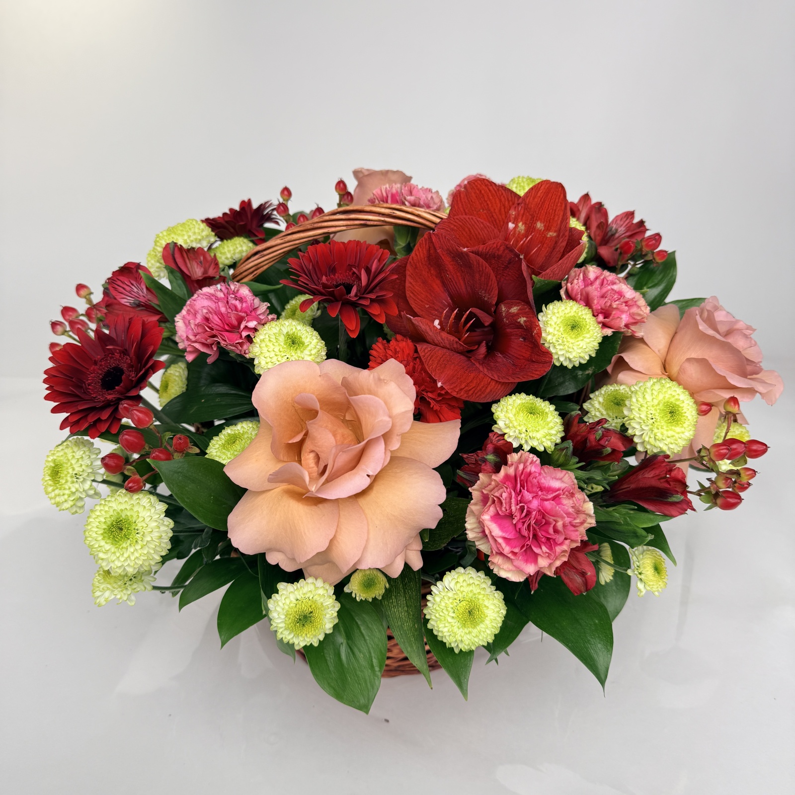 Состав: гвоздика 6, хризантема кустовая 5, гиперикум 5, гербера 3, роза 3, альстромерия 3, гиппеаструм 1, рускус 1 и прочее.