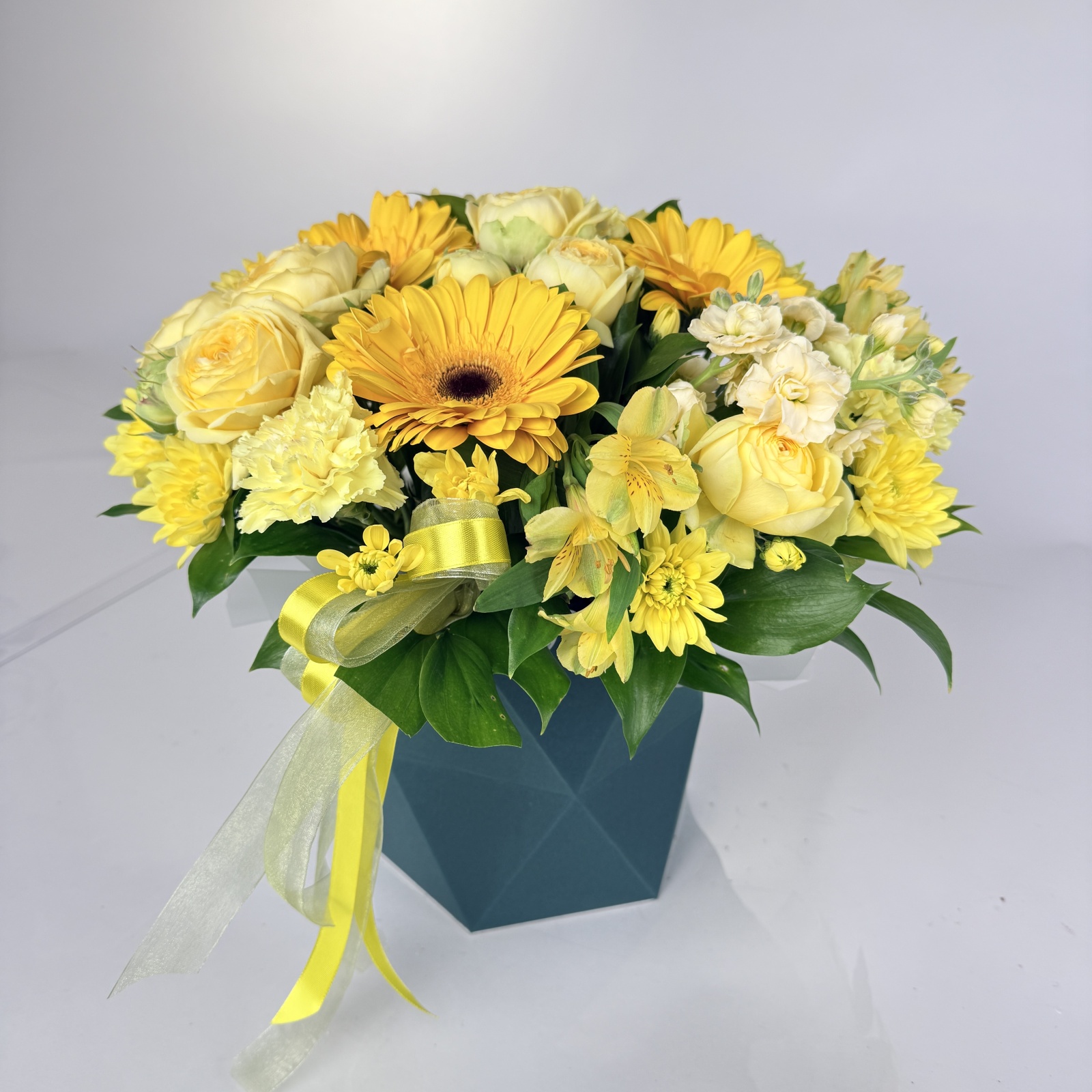 Состав: альстромерия 3, гвоздика 3, хризантема кустовая 3, гербера 3, роза кустовая 2, маттиола 1, рускус 0,5 и прочее. в наличии