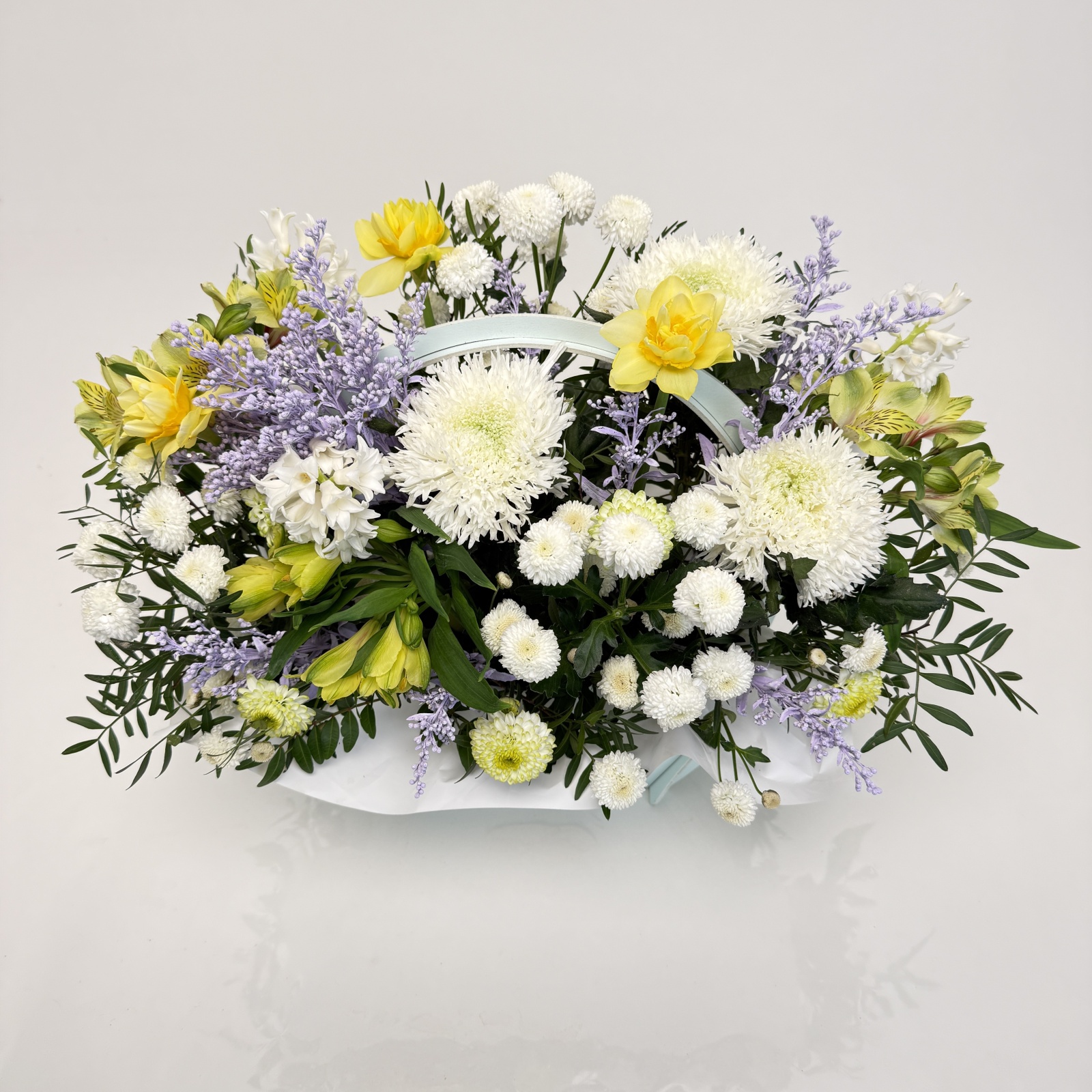 Состав: хризантема 3, альстромерия 3, хризантема кустовая 3, гиацинт 3, солидаго 1 и прочее. в наличии