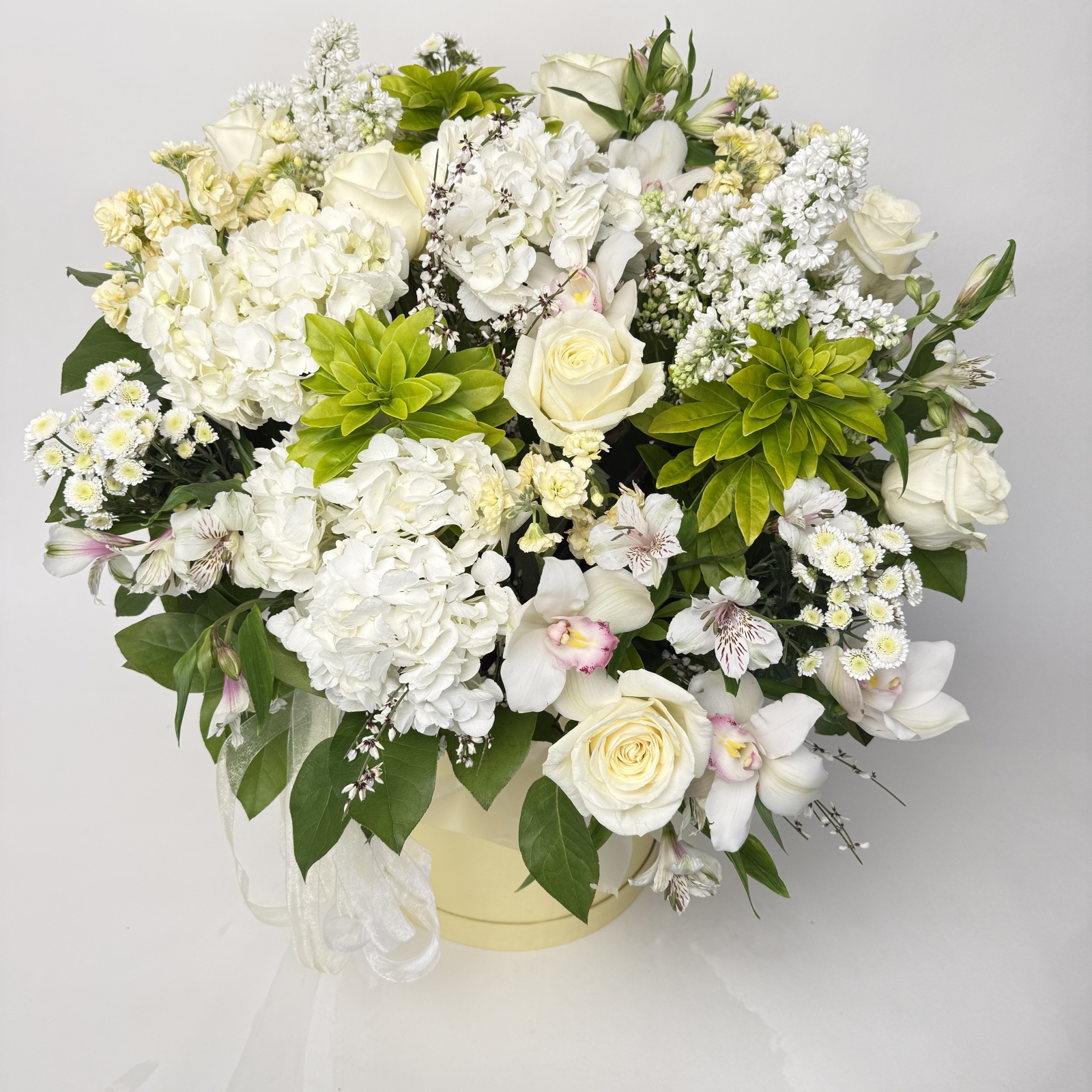 Состав: роза 7, хризантема кустовая 5, альстромерия 4, гортензия 3, маттиола 3, сирень 2, ветка цимбидиум 0,2 и прочее.