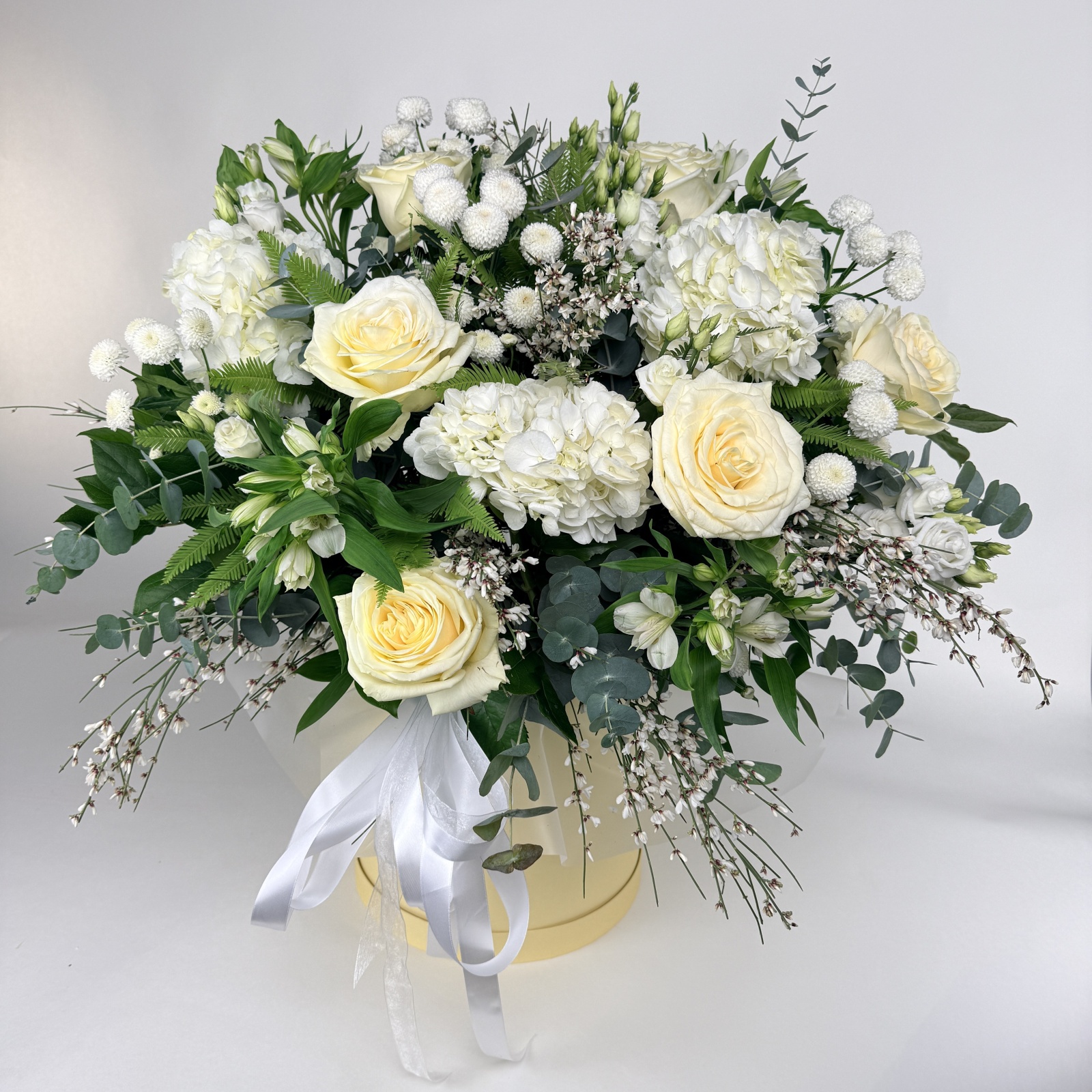 Состав: альстромерия 5, хризантема кустовая 5, эвкалипт 4, гортензия 3, лизиантус 3, лилия 1, салал 1, роза 1 и прочее. в наличии