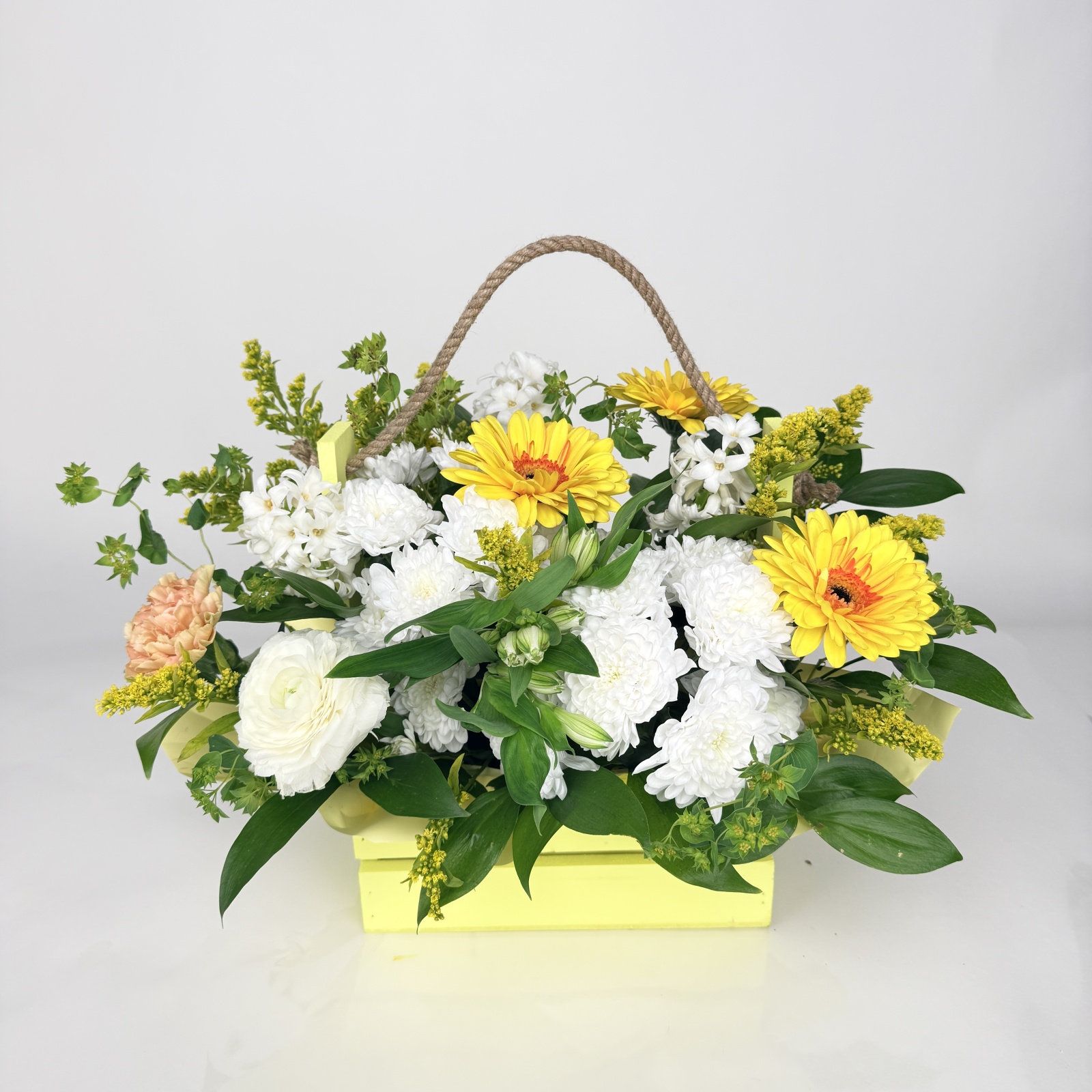 Состав: гербера 3, гиацинт 3, хризантема кустовая 2, рускус 1, солидаго 1, антирринум 1, альстромерия 1, гвоздика 1 и прочее. в наличии