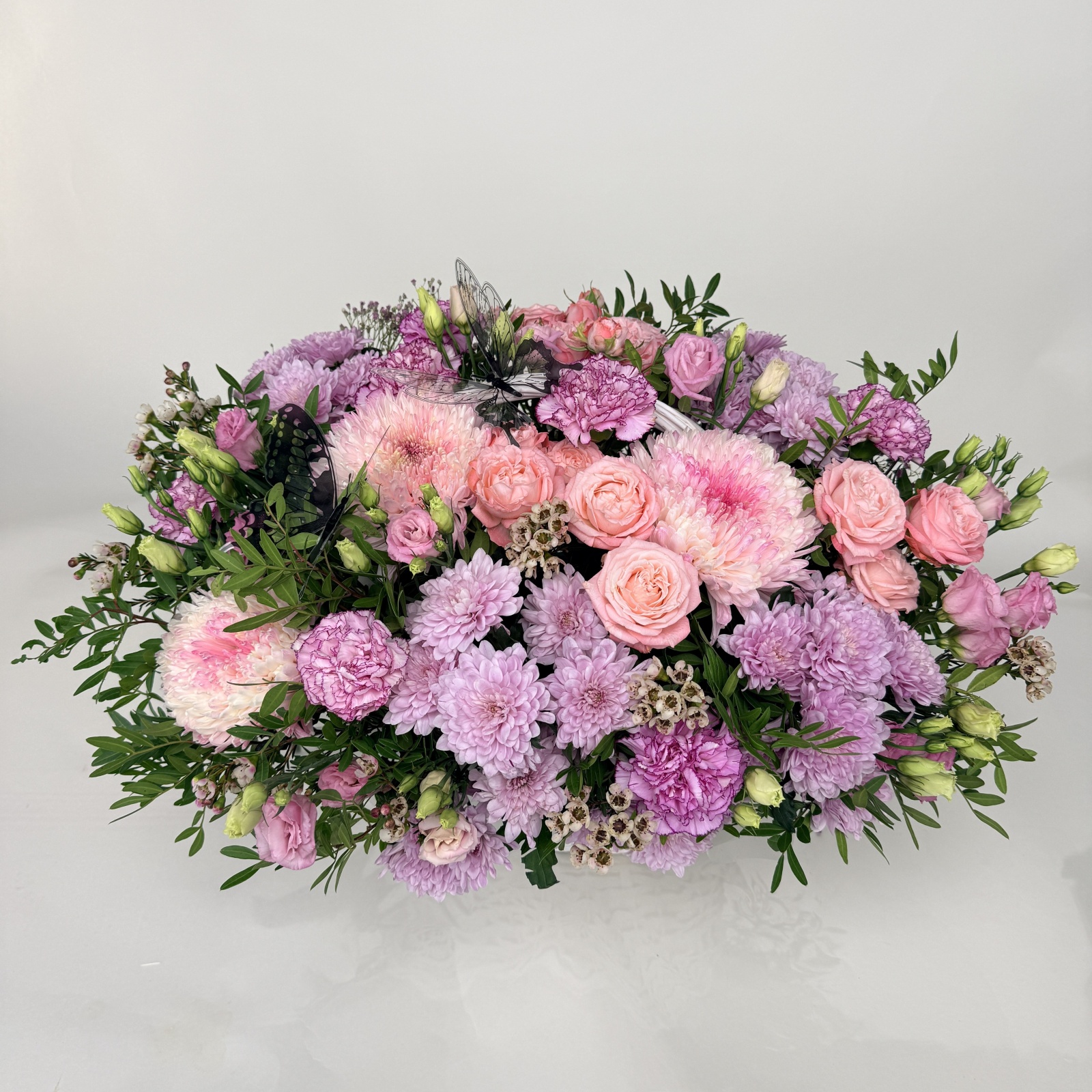 Состав: гвоздика 8, хризантема кустовая 5, лизиантус 3, роза кустовая 3, хризантема 3, хамелациум 2, фисташка 1 и прочее. в наличии