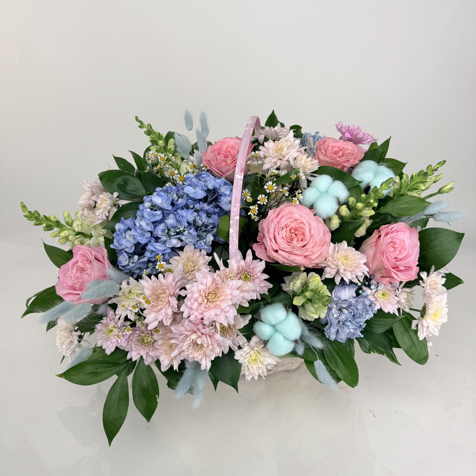 Состав: антирринум 5, роза 4, хризантема кустовая 3, гвоздика 2, роза кустовая 1, гортензия 1, рускус 1 и прочее. в наличии