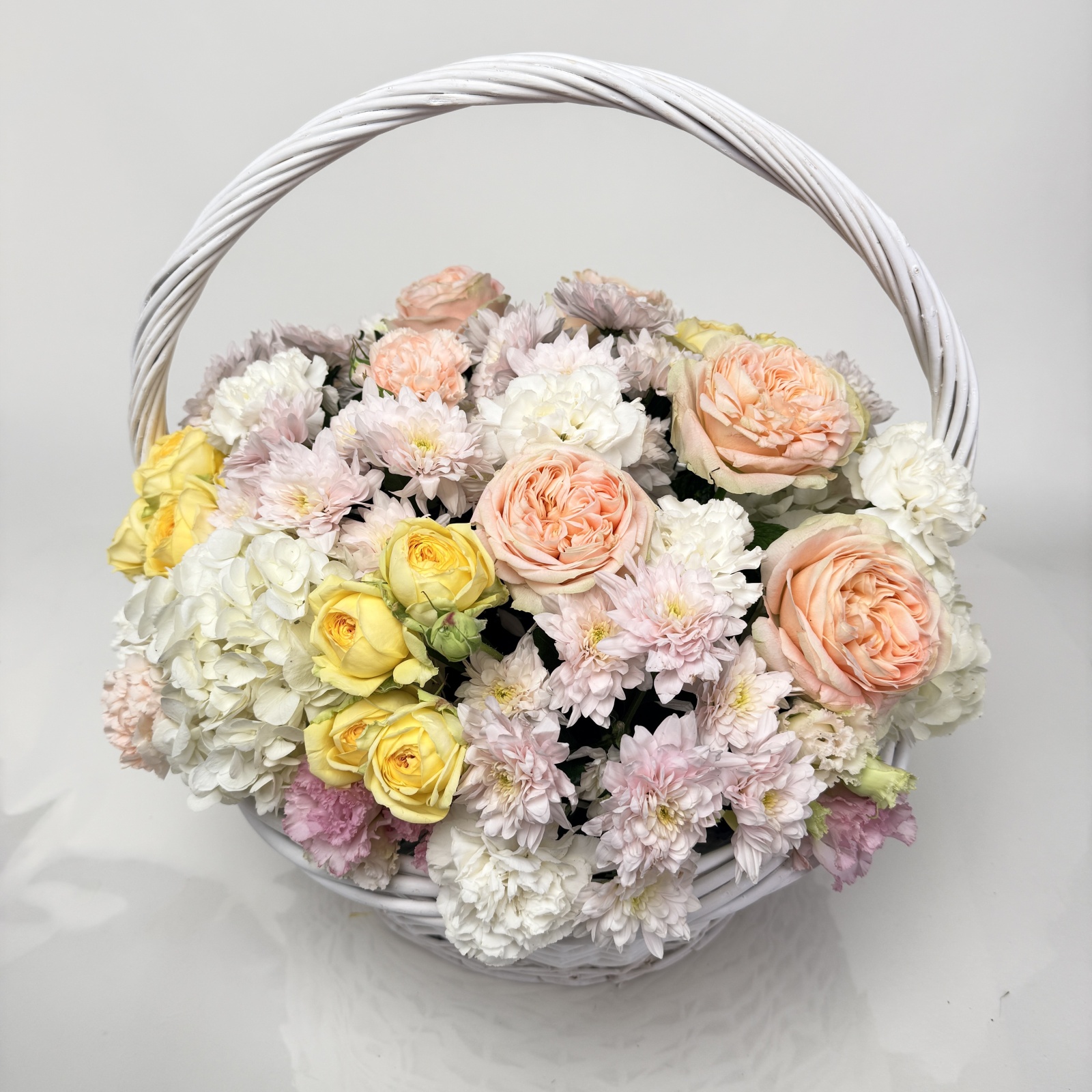 Состав: гвоздика 9, роза 7, роза кустовая 3, гортензия 3, лизиантус 1 и прочее. в наличии
