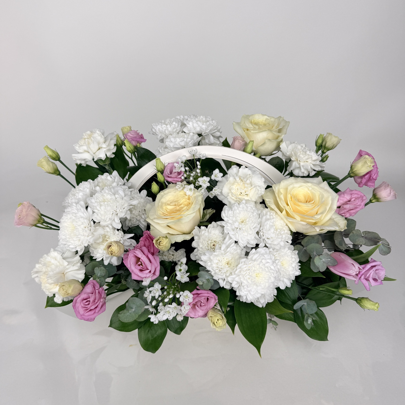 Состав: гвоздика 4, роза 3, хризантема кустовая 3, лизиантус 2, эвкалипт 1 и прочее. в наличии
