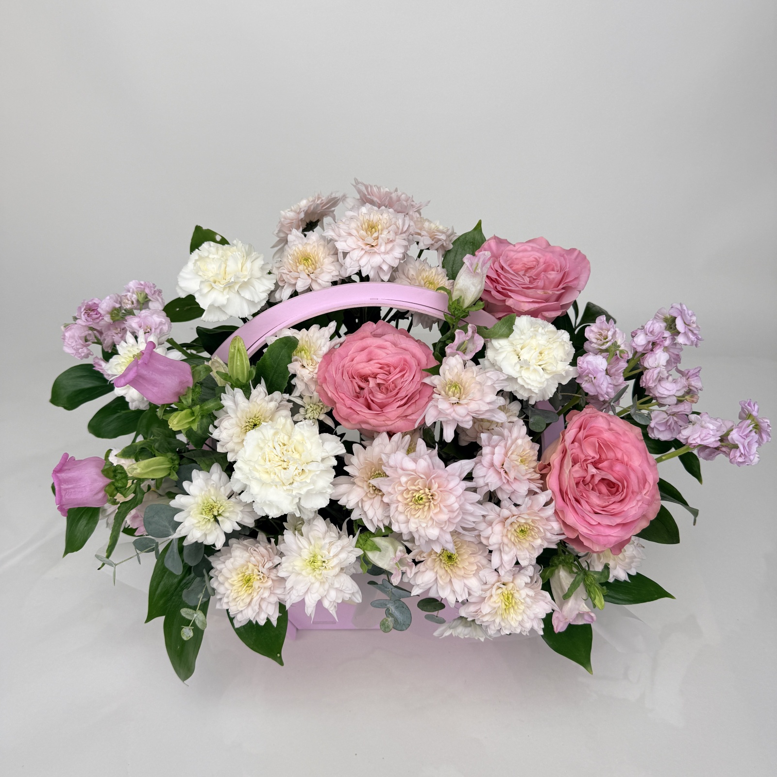 Состав: хризантема кустовая 4, роза 3, гвоздика 3, маттиола 2, лизиантус 1 и прочее. в наличии