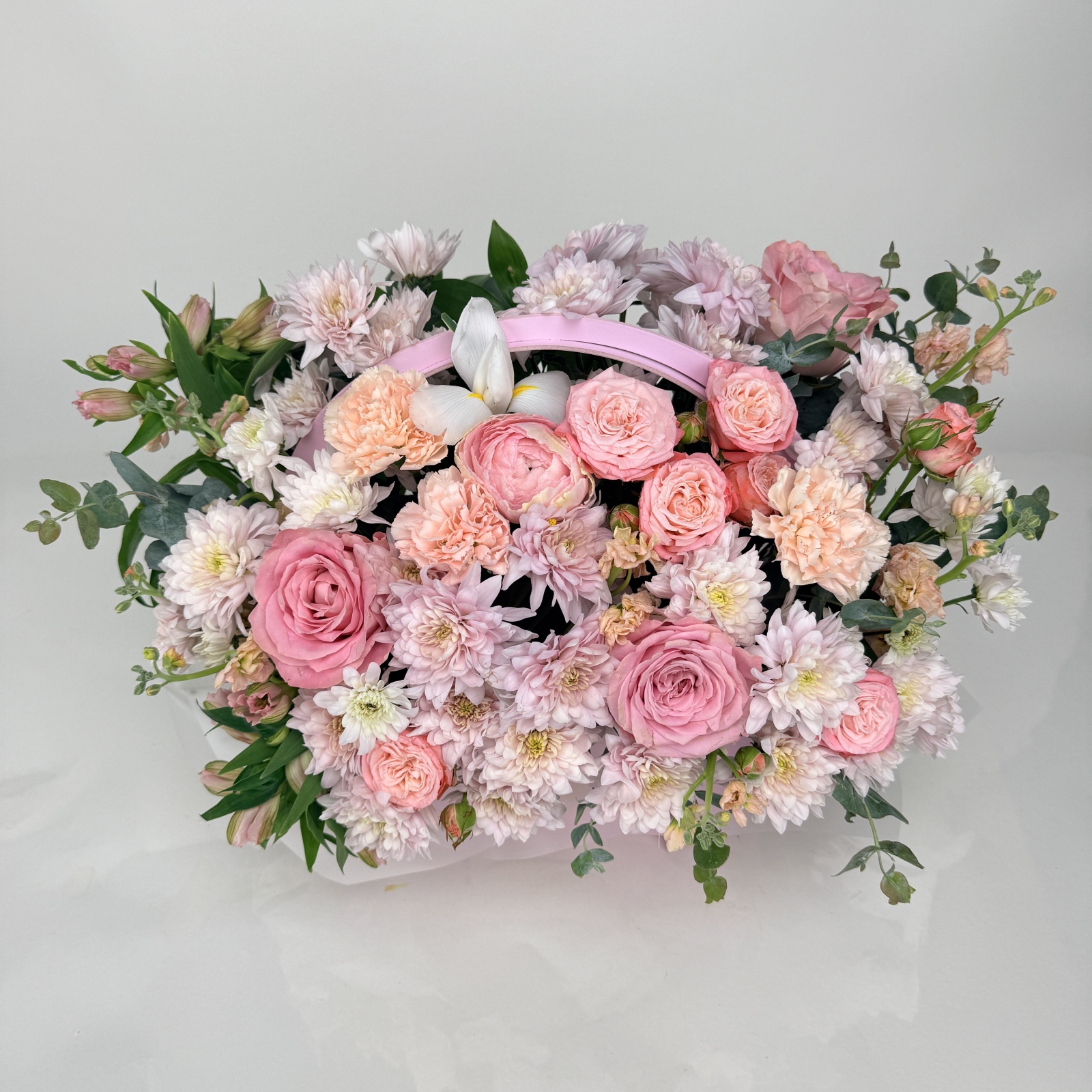 Состав: роза 3, гвоздика 3, хризантема кустовая 3, маттиола 2, альстромерия 2, роза кустовая 1, ранункулюс 1, эвкалипт 1, ирис 1, рускус 0,4 и прочее. в наличии