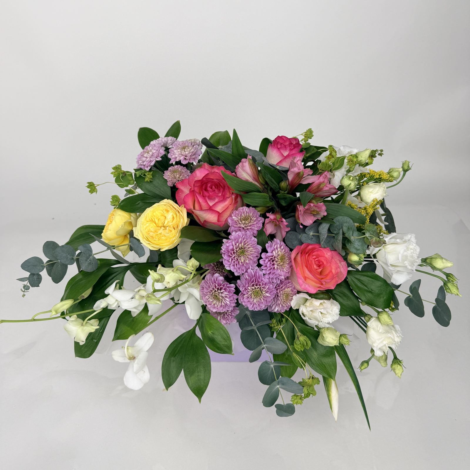 Состав: роза 3, хризантема кустовая 2, лизиантус 2, дендробиум 2, эвкалипт 1, альстромерия 1, роза кустовая 1, рускус 0,5 и прочее. в наличии