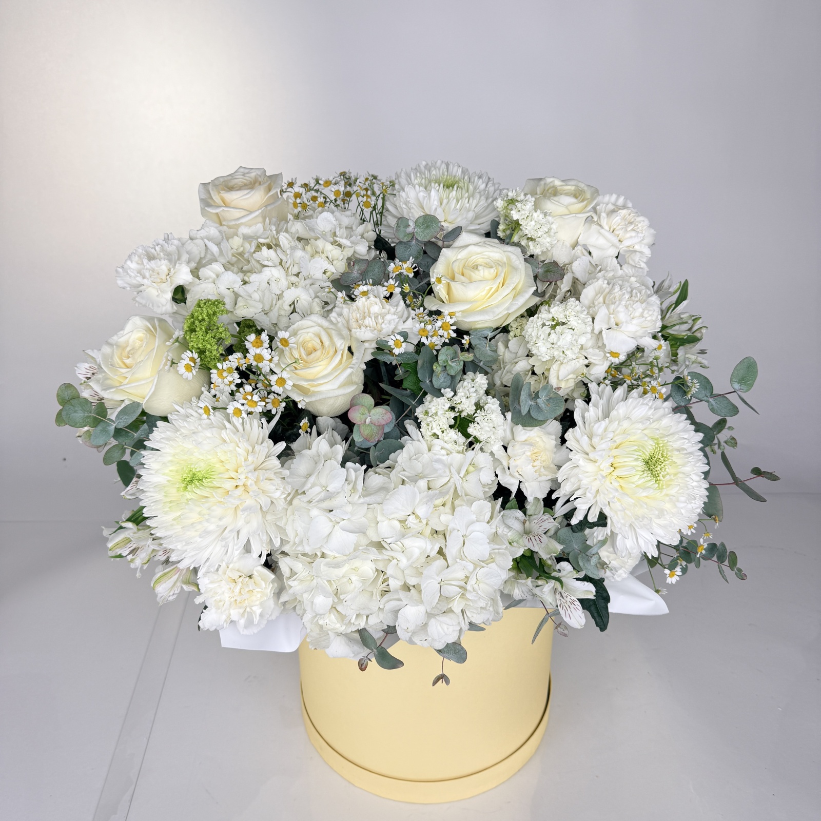 Состав: гвоздика 29, роза 5, альстромерия 5, хризантема 3, эвкалипт 3, гортензия 3, вибурнум 2, рускус 0,5 и прочее. в наличии