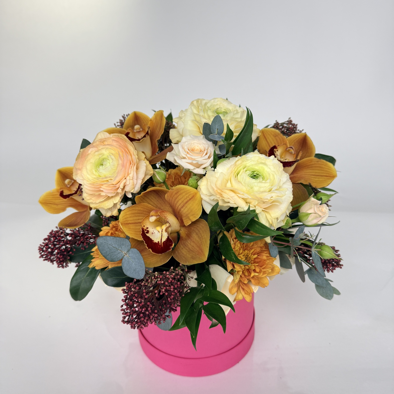 Состав: ранункулюс 4, салал 0,6, ветка цимбидиум 0,4 и прочее. в наличии