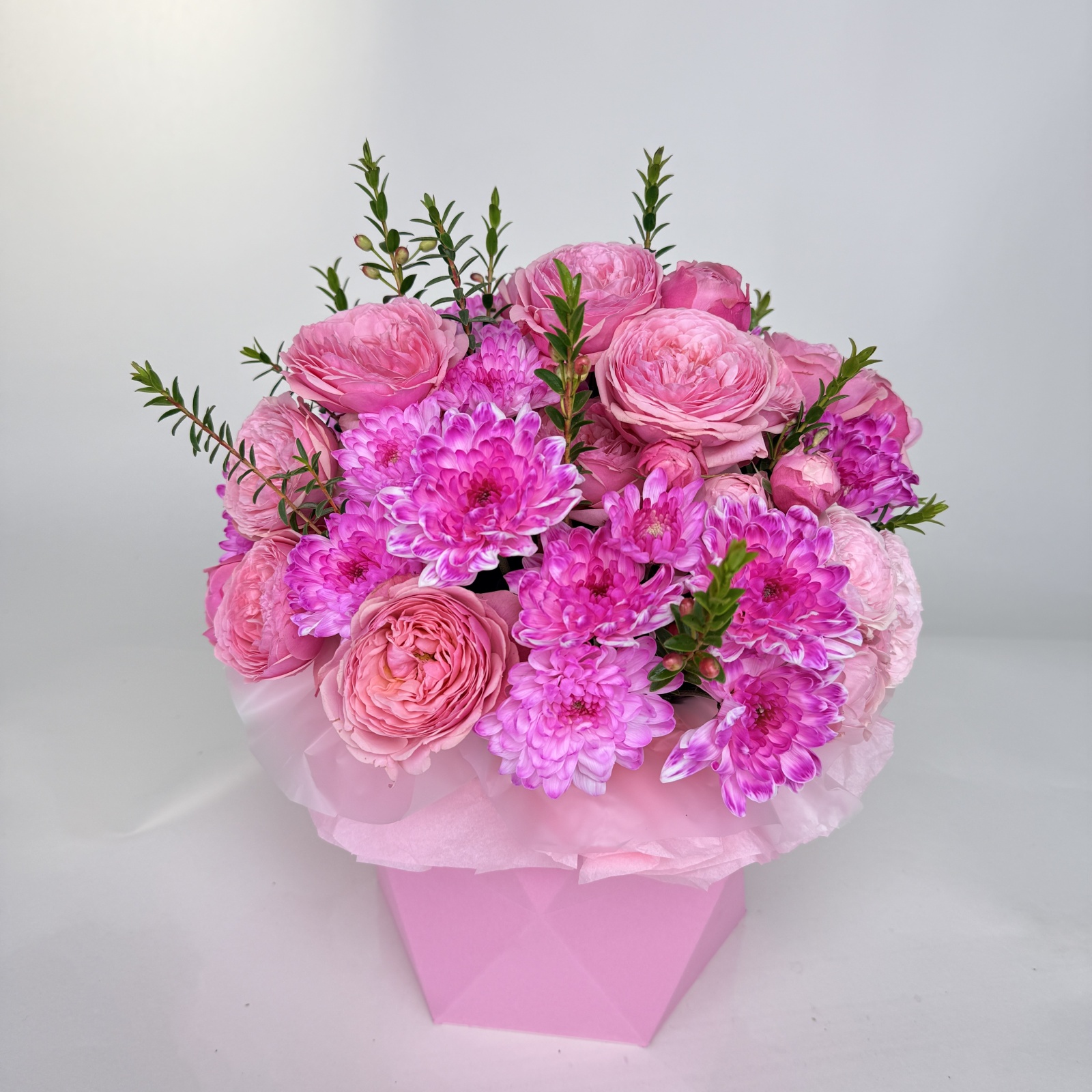 Состав: роза кустовая 4, хризантема кустовая 2, хамелациум 1 и прочее. в наличии