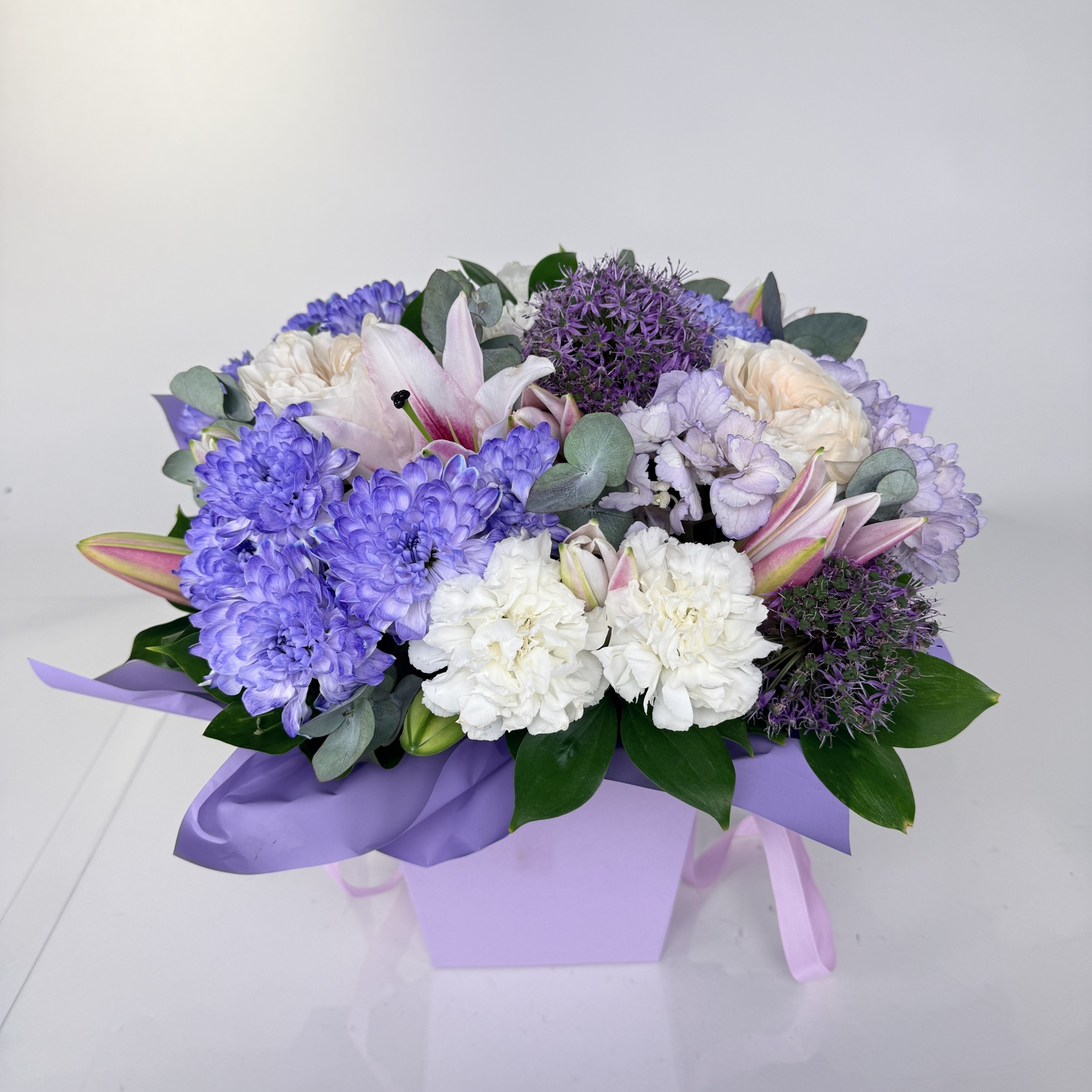 Состав: роза 3, гвоздика 3, хризантема кустовая 3, гортензия 1, эвкалипт 1 и прочее. в наличии