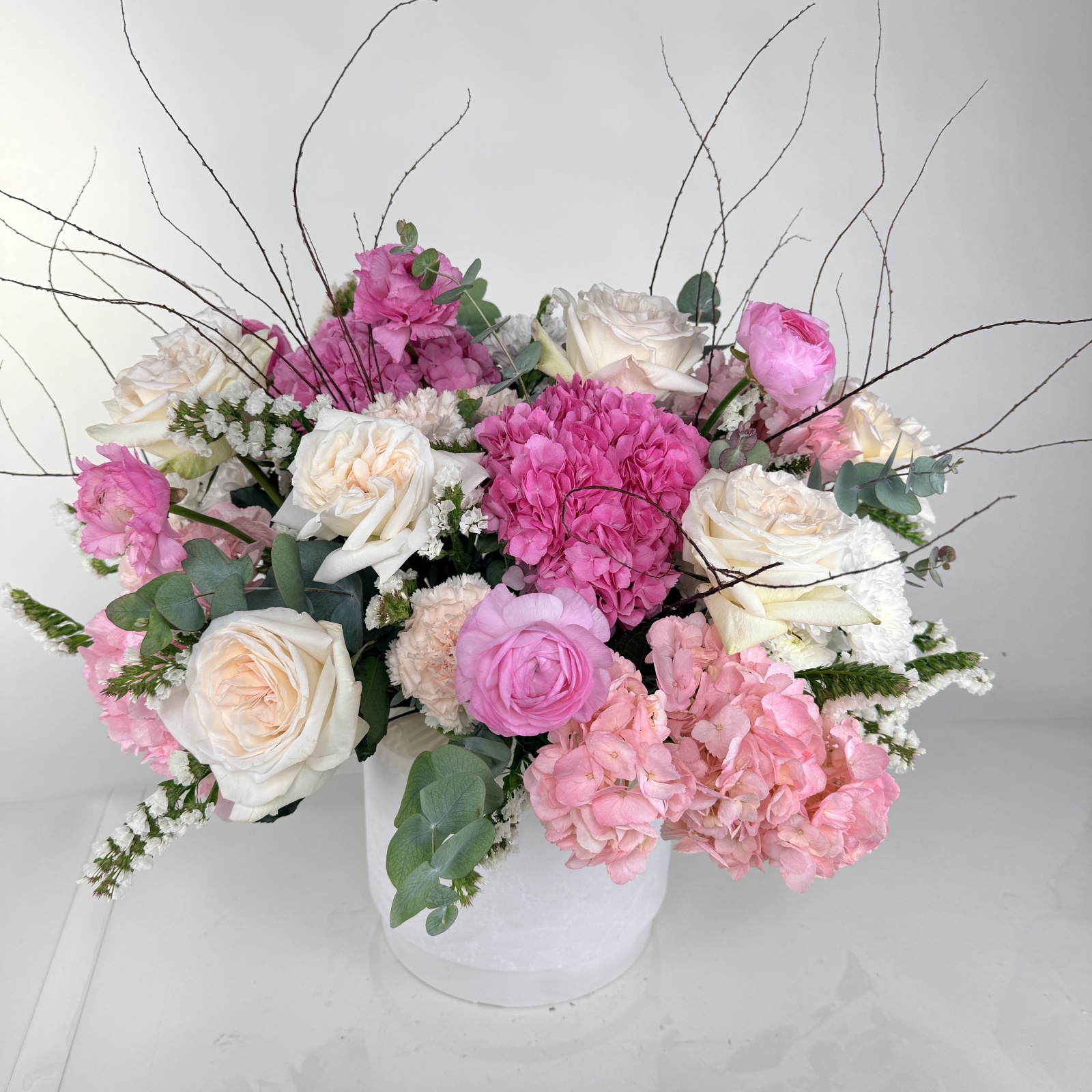 Состав: гвоздика 7, роза 7, ранункулюс 7, гортензия 5, статица 4, эвкалипт 4, хризантема кустовая 3, хризантема 2 и прочее. в наличии