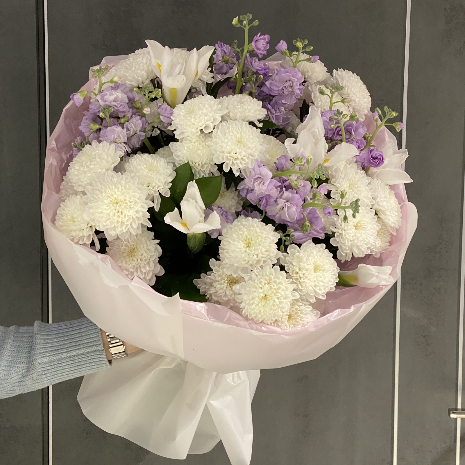 Состав: хризантема кустовая 6, ирис 5, маттиола 4, рускус 0,5 и прочее. под заказ