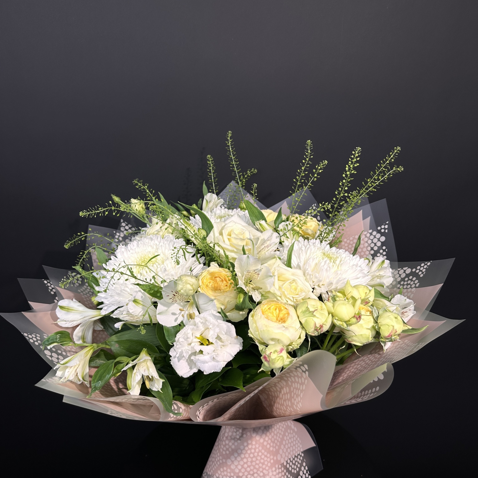Состав: альстромерия 4, хризантема 3, роза 3, роза кустовая 2, лизиантус 2, рускус 1 и прочее. под заказ