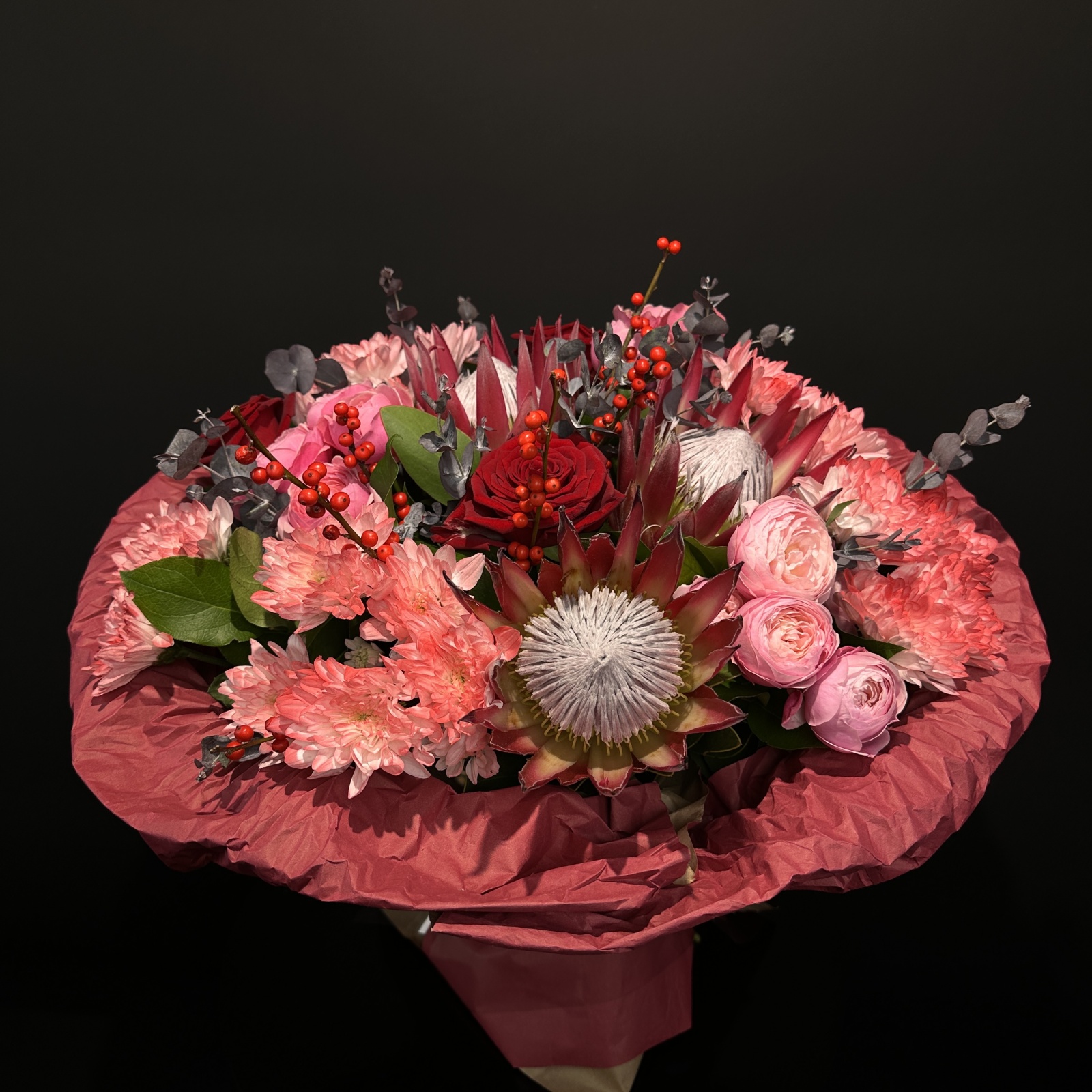 Состав: хризантема кустовая 5, роза 3, роза кустовая 3, эвкалипт 2, салал 0,5 и прочее. под заказ