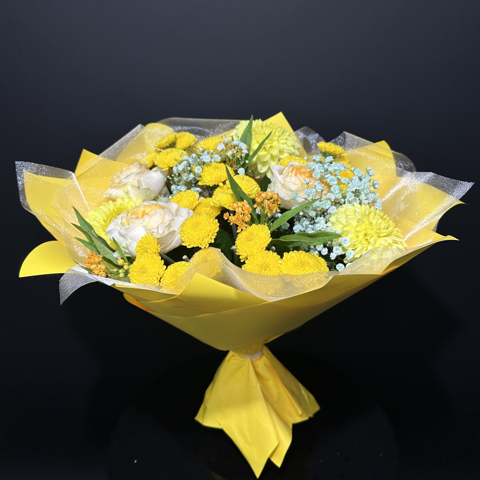 Состав: хризантема кустовая 7, роза 3, рускус 0,5 и прочее.