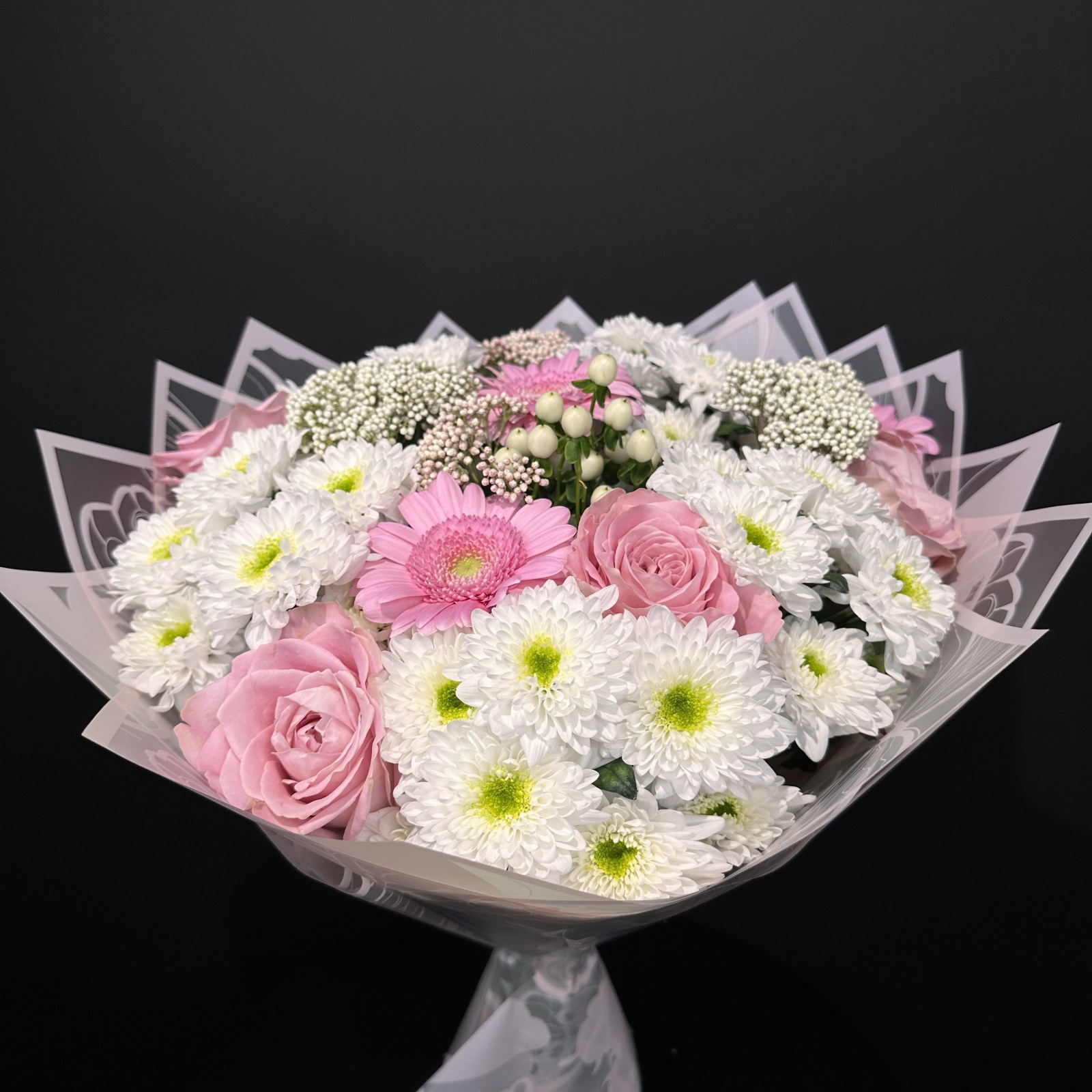 Состав: роза 5, хризантема кустовая 5, гербера 3, гиперикум 2, хамелациум 2 и прочее. под заказ