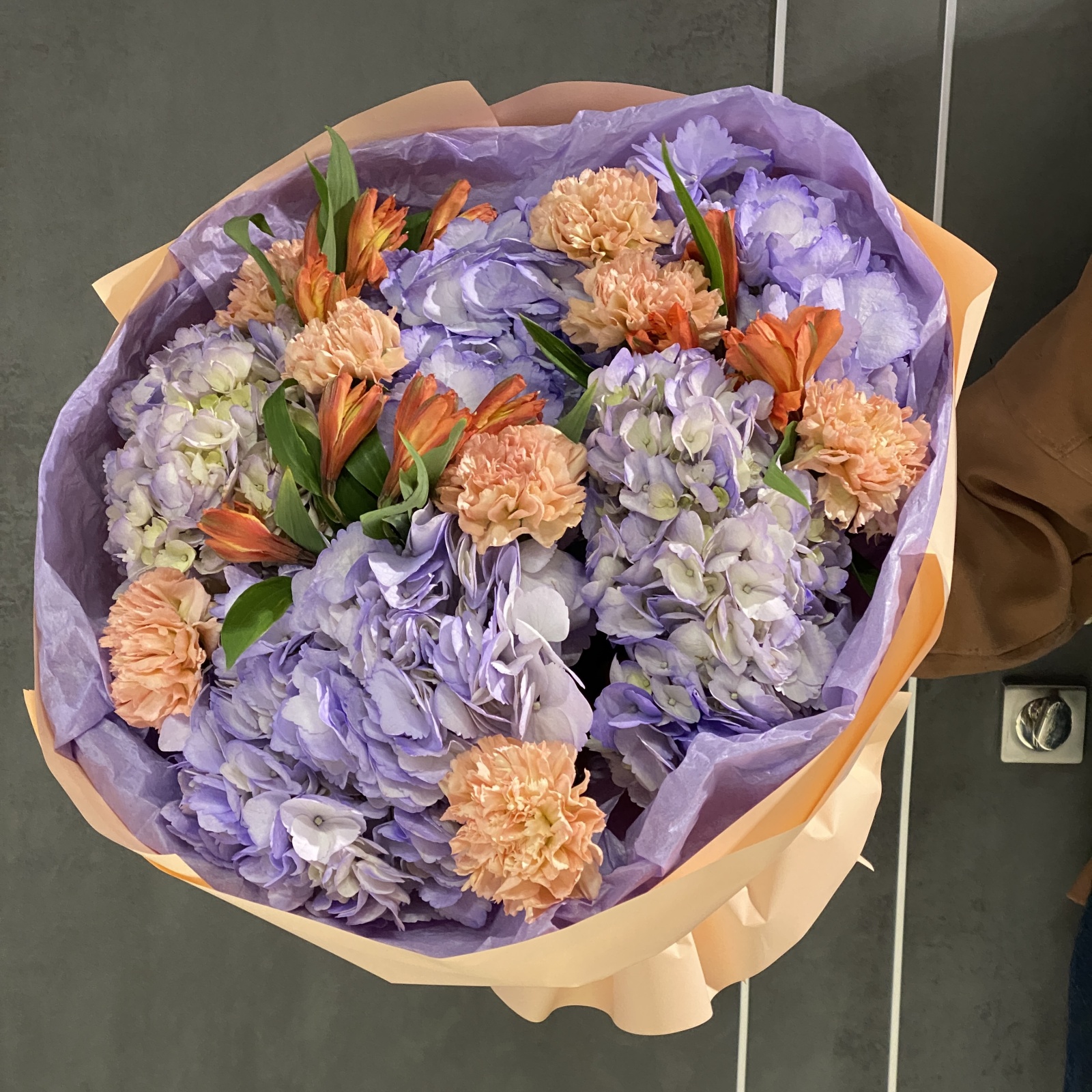 Состав: гвоздика 7, гортензия 5, альстромерия 3 и прочее. в наличии