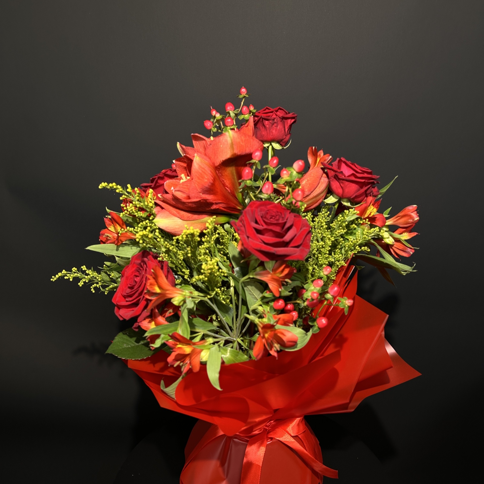 Состав: роза 5, альстромерия 5, гиперикум 2, солидаго 2, гиппеаструм 1 и прочее. под заказ