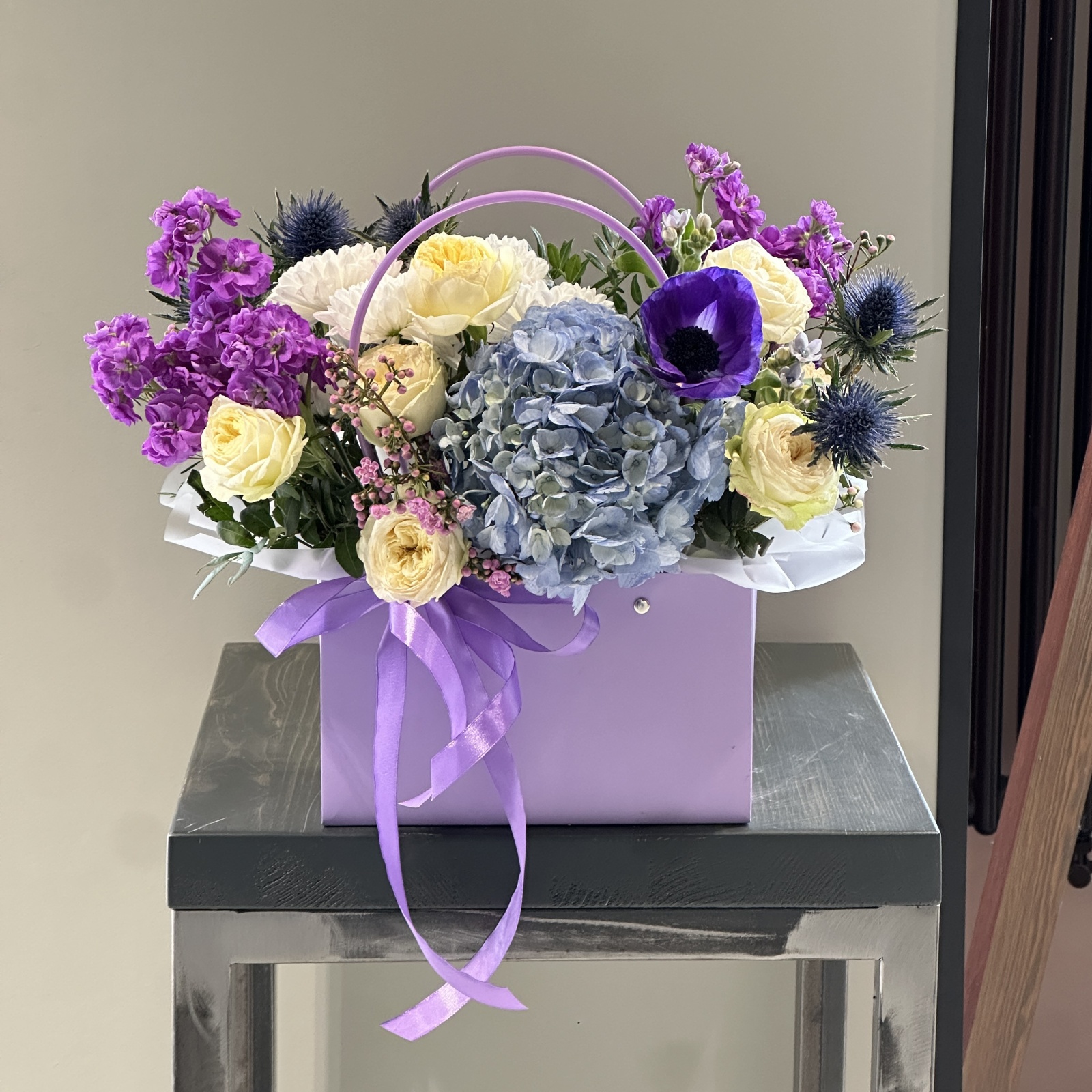 Состав: маттиола 2, оксипеталум 2, хамелациум 2, эрингиум 2, роза кустовая 1, хризантема кустовая 1, гортензия 1, анемон 1, фисташка 0,5 и прочее. в наличии
