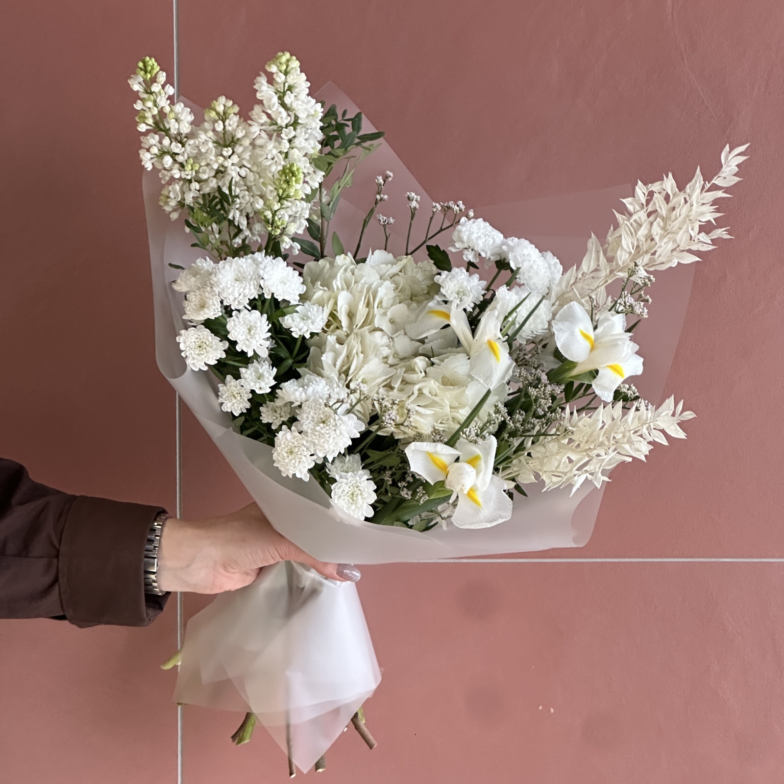 Состав: хризантема 3, ирис 3, рускус 2, лимониум 1, сирень 1, гортензия 1, фисташка 0,3 и прочее. в наличии