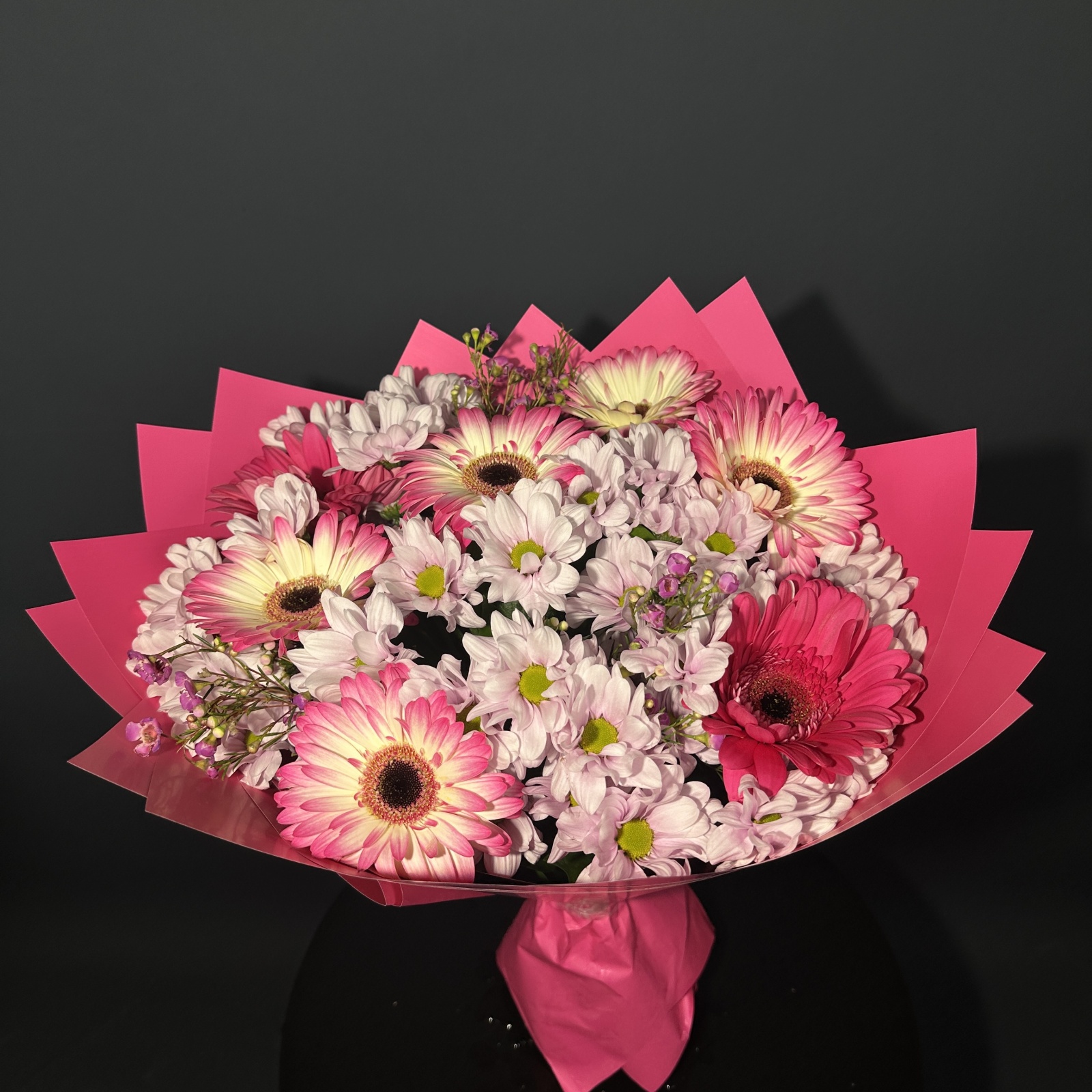Состав: гербера 7, хризантема кустовая 6, хамелациум 1, рускус 0,5 и прочее. под заказ