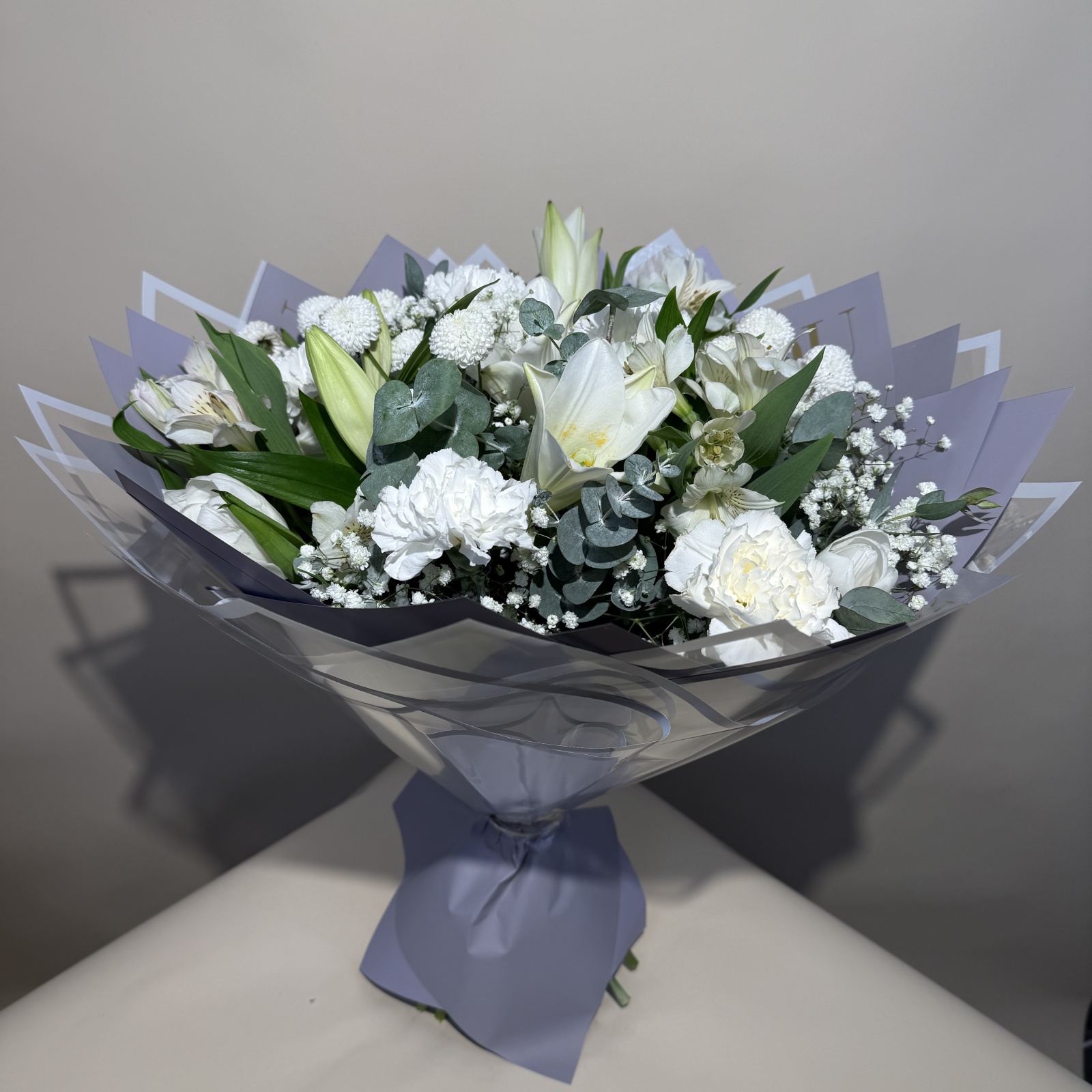 Состав: тюльпан 6, гвоздика 5, хризантема кустовая 3, альстромерия 3, гипсофила 3, лилия 2, эвкалипт 2, гербера 1 и прочее. под заказ