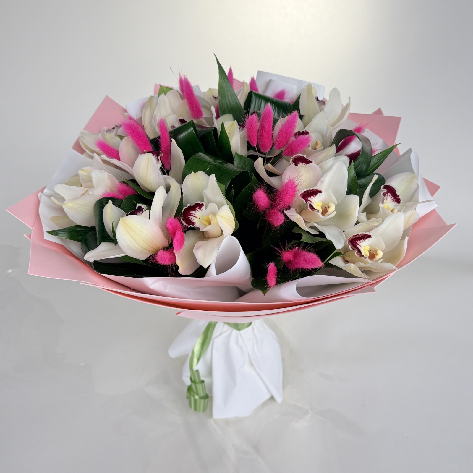 Состав: гербера 5, аспидистра 5, ветка цимбидиум 1, салал 0,5 и прочее. под заказ