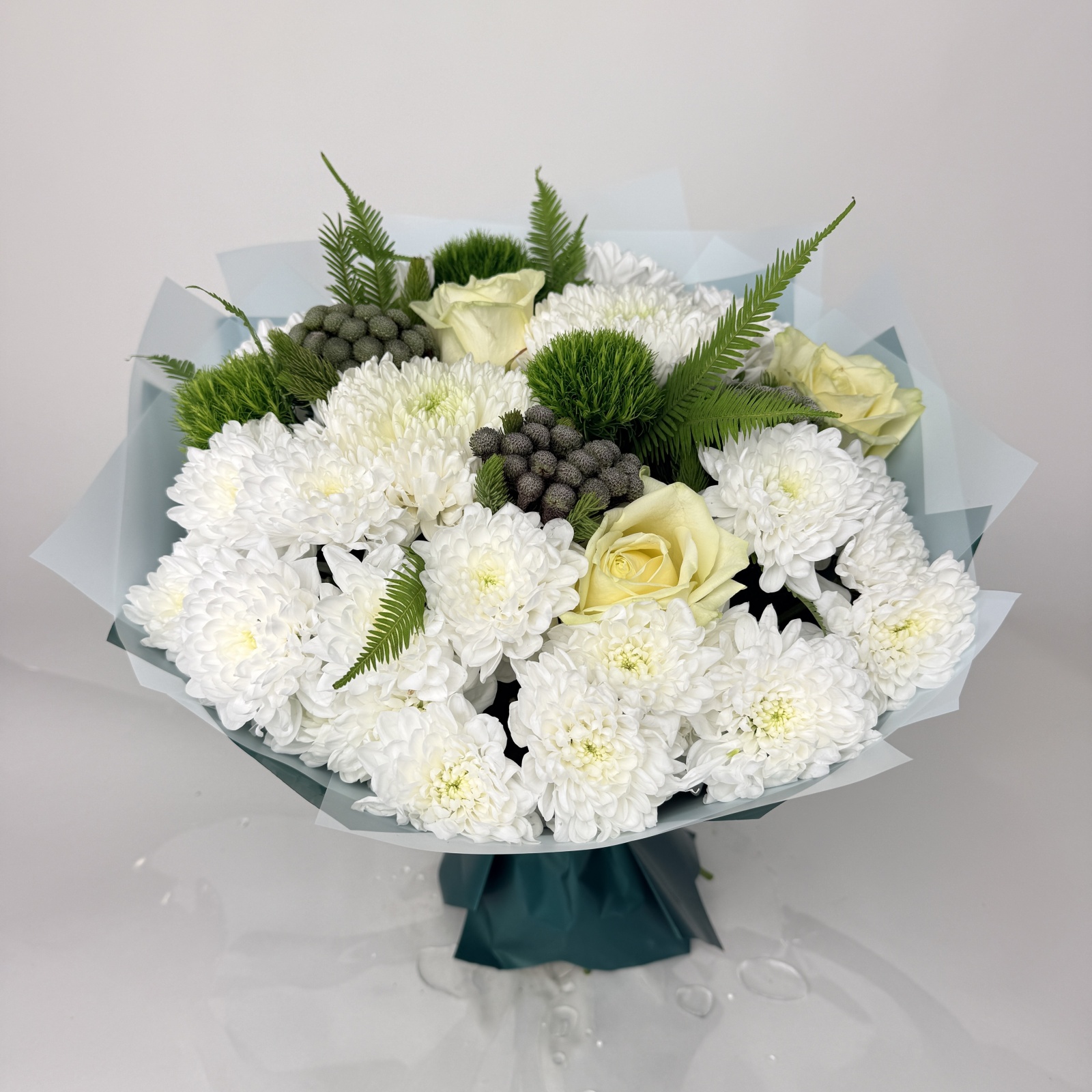 Состав: хризантема кустовая 5, роза 3, гвоздика 3, бруния 3, хризантема 2, гербера 1, рускус 0,5 и прочее. под заказ