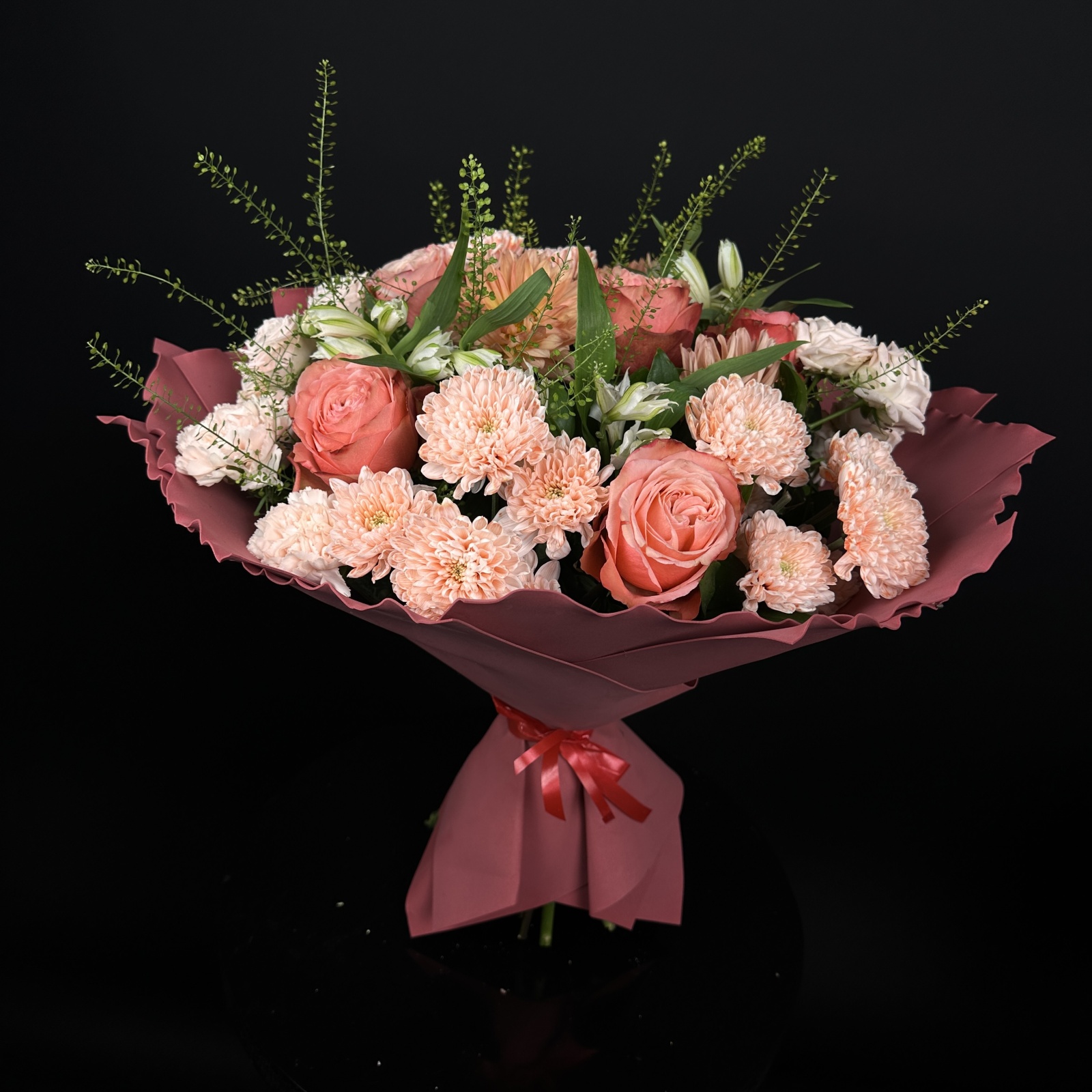 Состав: роза 4, альстромерия 3, хризантема кустовая 3, роза кустовая 2, рускус 1 и прочее. под заказ