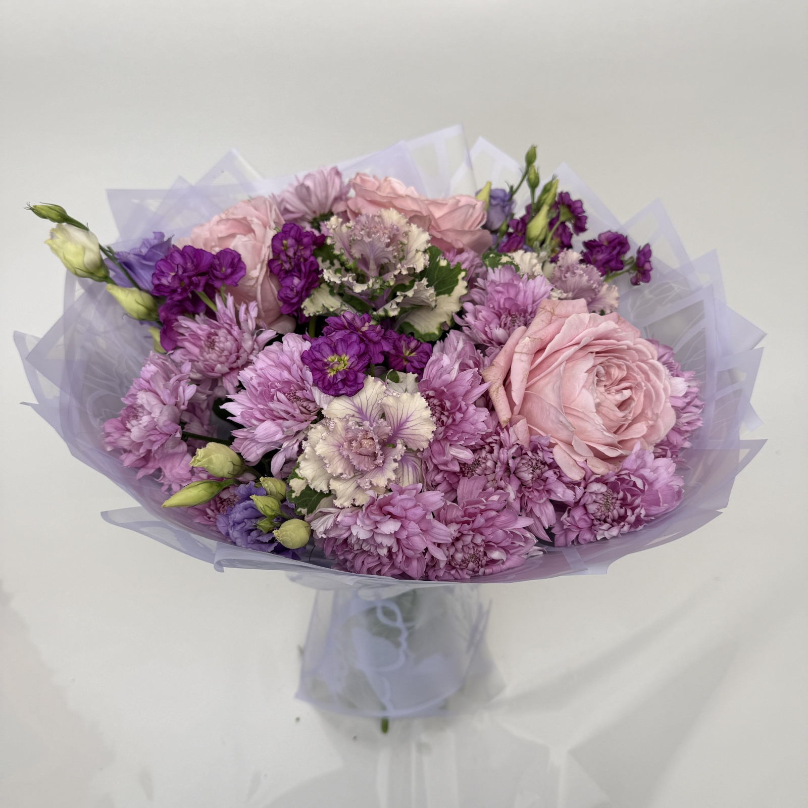 Состав: хризантема кустовая 4, лизиантус 3, роза 3, маттиола 2, рускус 0,5 и прочее. под заказ