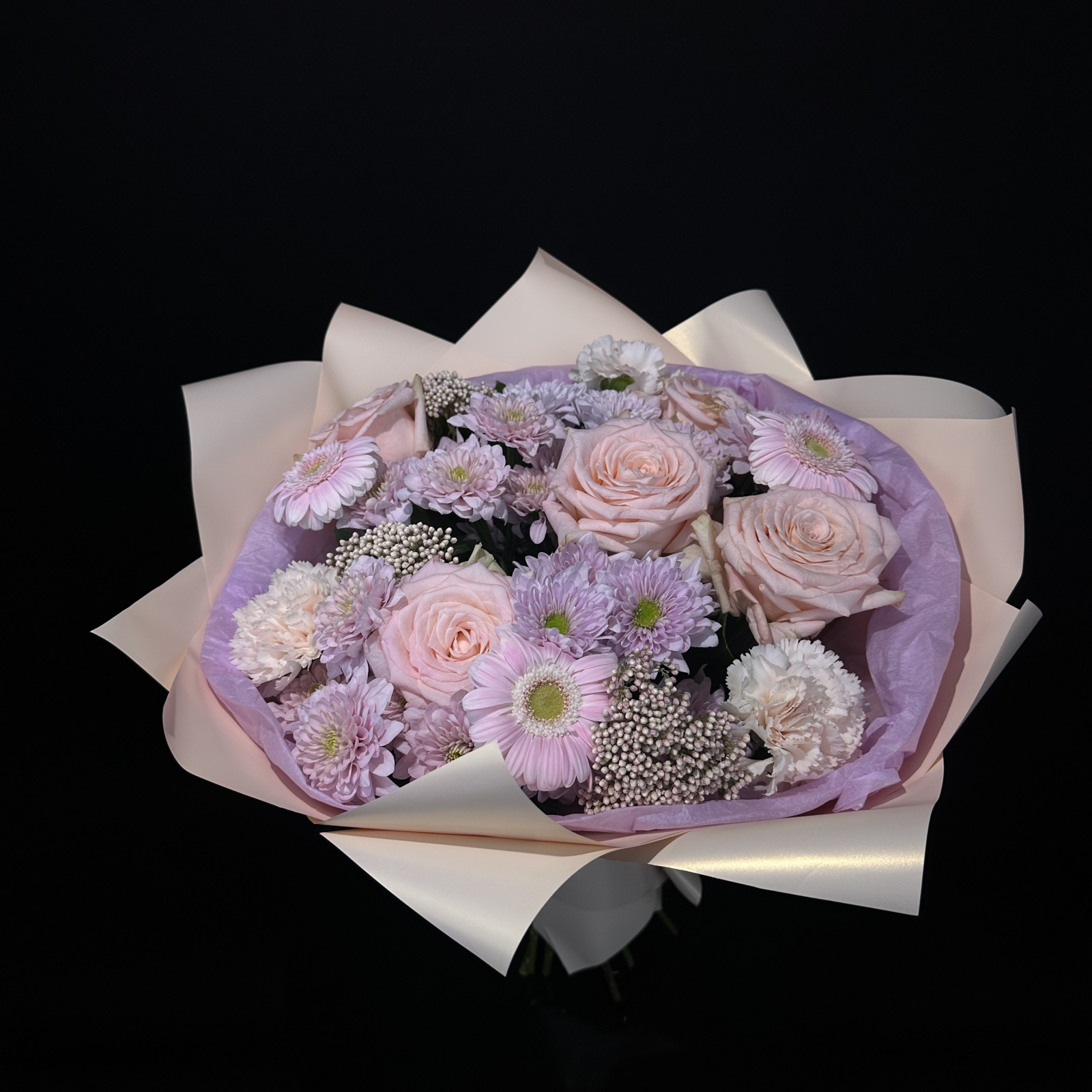 Состав: роза 5, хризантема кустовая 4, гвоздика 3, гербера 3, аралия 1, рускус 1 и прочее. под заказ